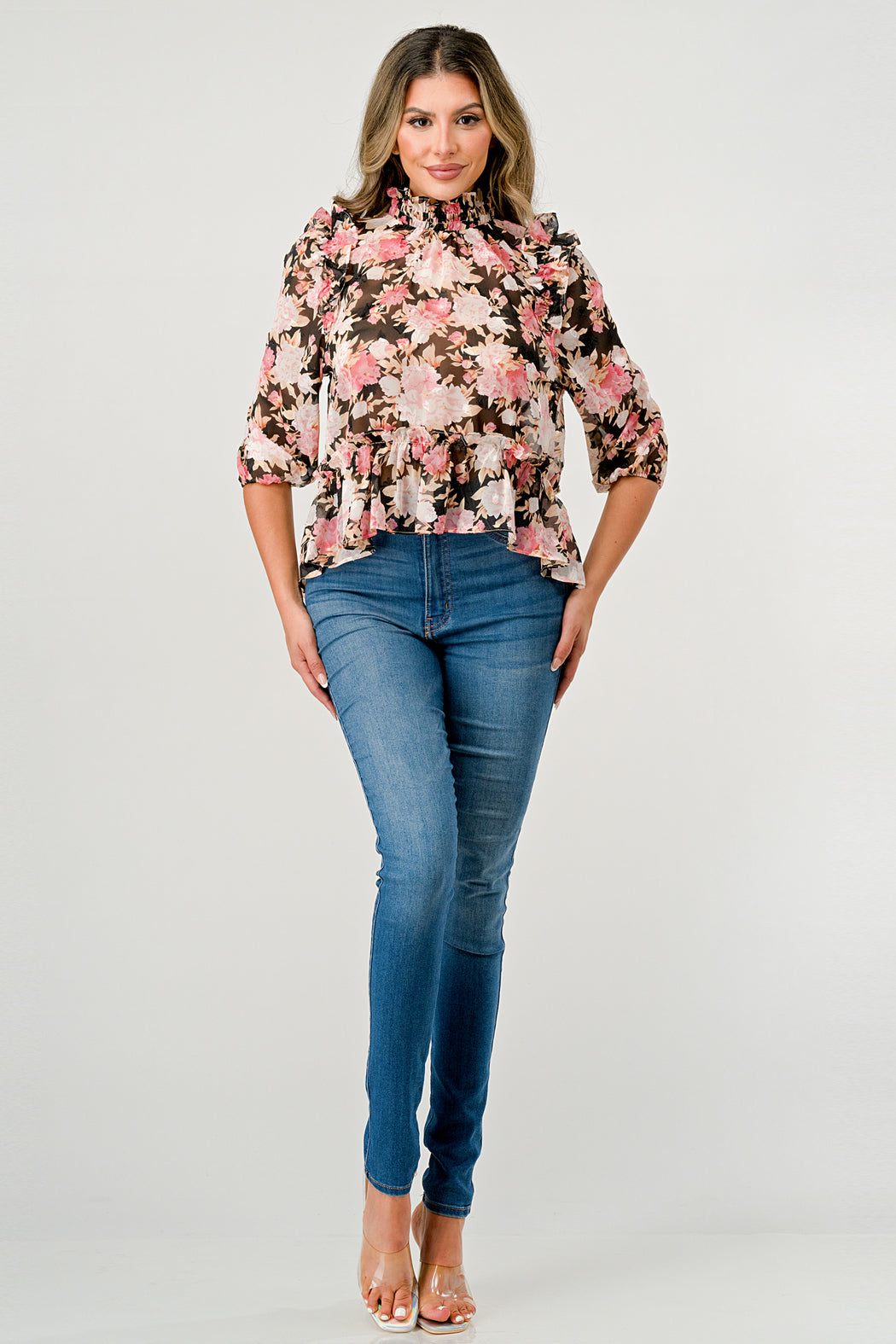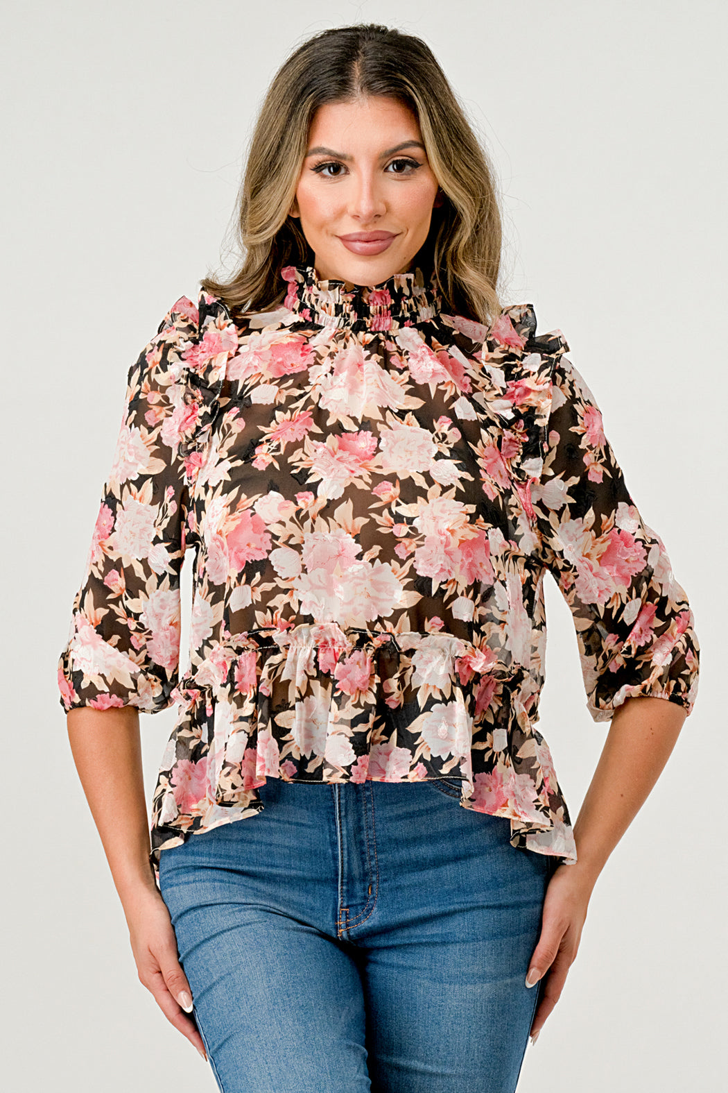 Ruffle detailed Hi-low long sleeve blouse top in floral chiffon