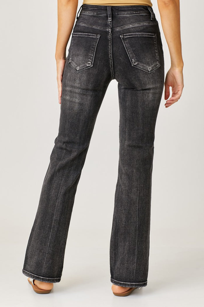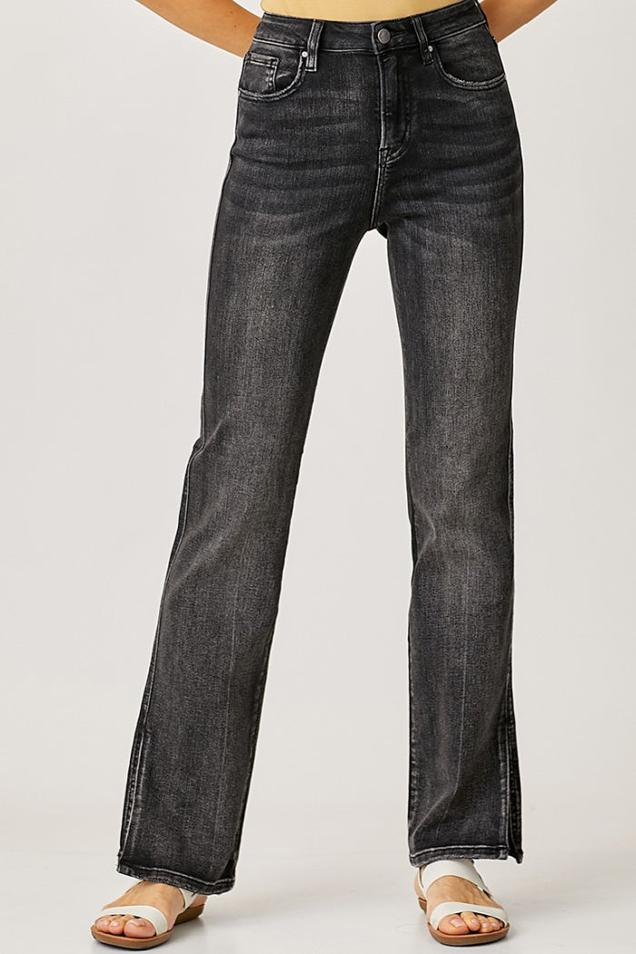 High rise, straight fit jeans in washed black with side slit and 5 pocket detail. Great stretch. See photos for size chart.