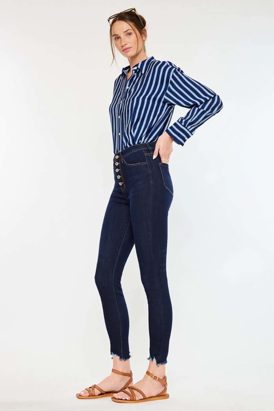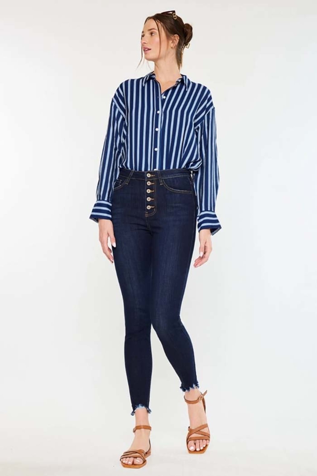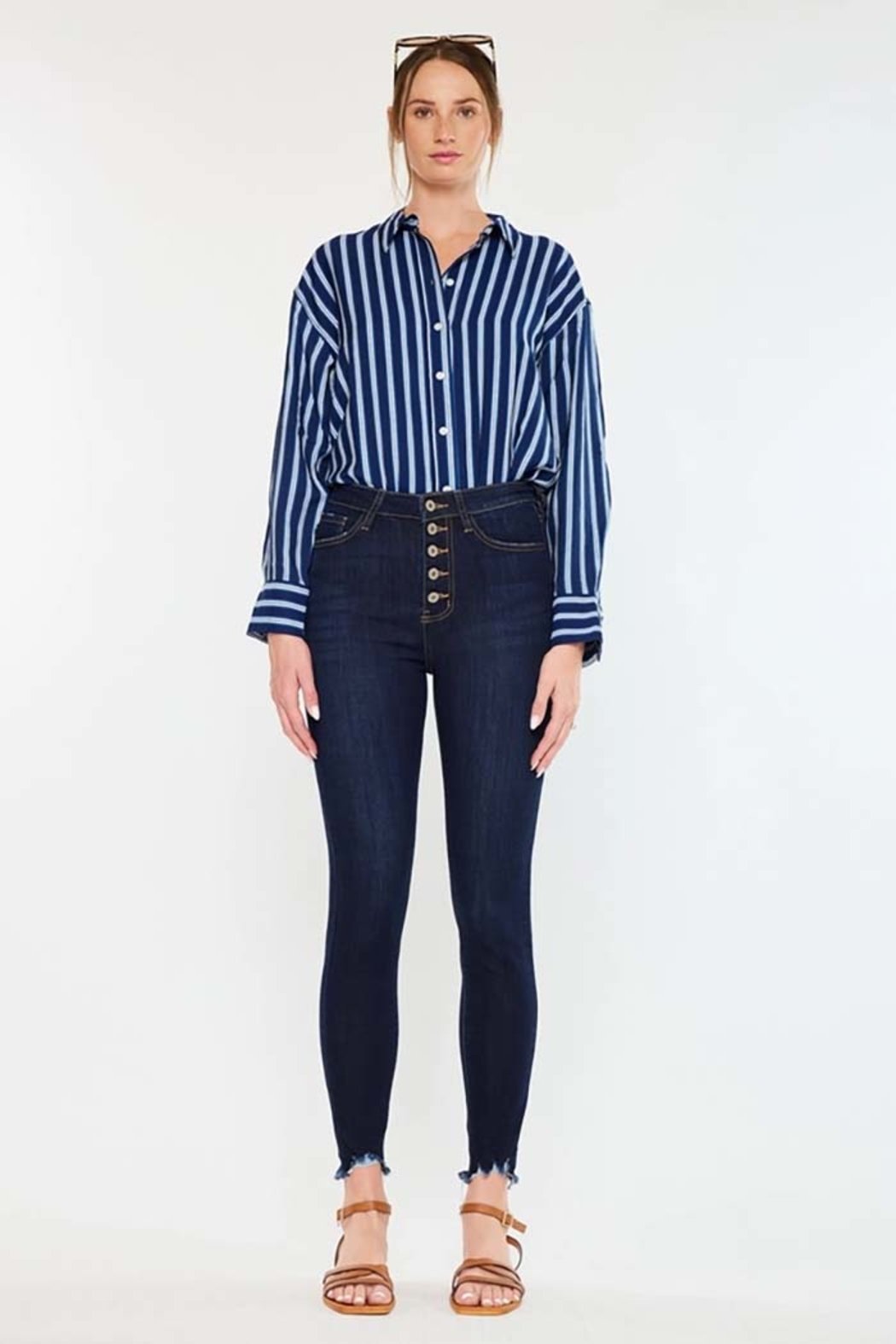 Chic high rise dark wash super skinny jeans with exposed button fly and frayed hem. Stretch denim hugs your curves for comfort and style, day or night.