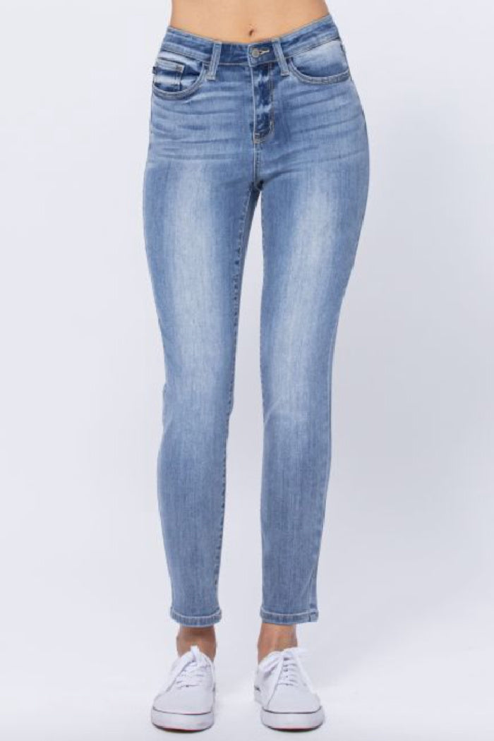 Your favorite denim in a relaxed fit, high waist jean! Five pocket design, light wash color. Has great stretch. See size chart in photos for sizing.