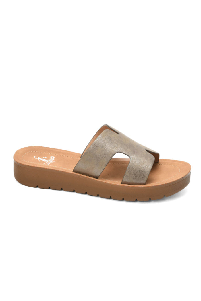 Step into effortless style and comfort with Corkys Hold Please Slide Sandal in Bronze. This playful and comfy sandal features a sleek slide design that will keep you looking trendy, while providing all-day comfort. This one is a must-have!