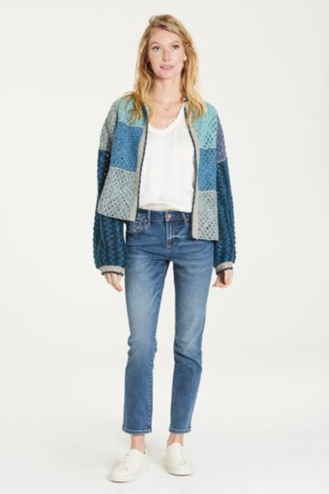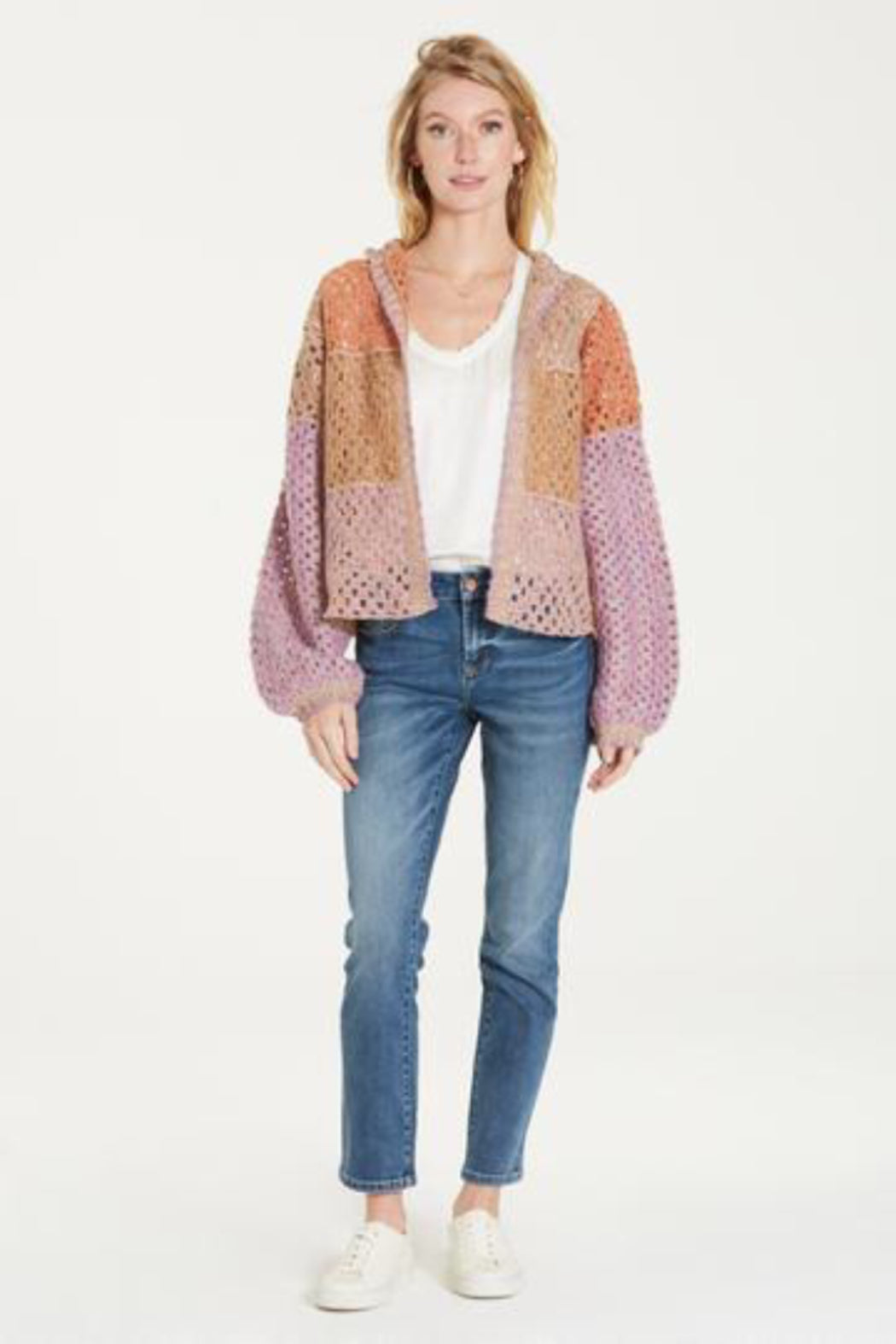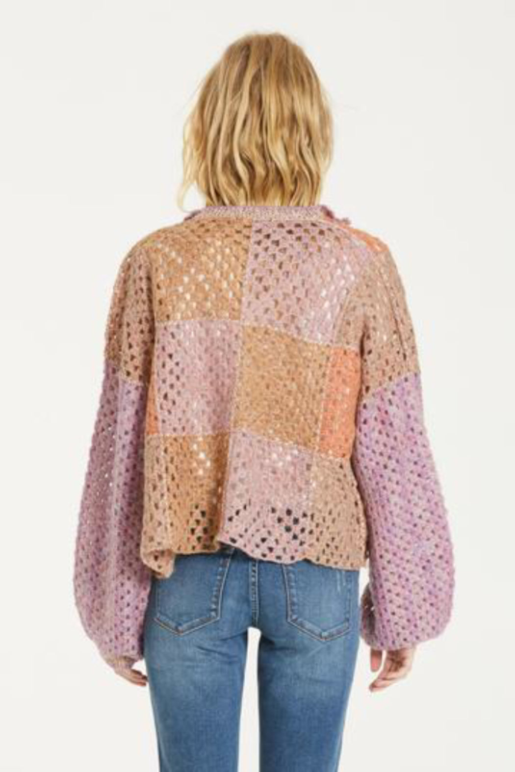 Handmade pointelle, bell long sleeve jacket finish with patchwork panels. Color block with lyrics shine yarn on relaxed fit, styled with contrast neck and cuff band.