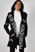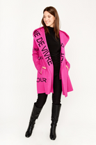 Designed by Frank Lyman, this cozy knit is ideal for the cool weather. It features a longer hemline, open front, and comfy hood that you can easily wrap yourself in. If you're looking to step up your off-duty dressing, the design features catchy messaging to add to its overall aesthetic.