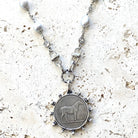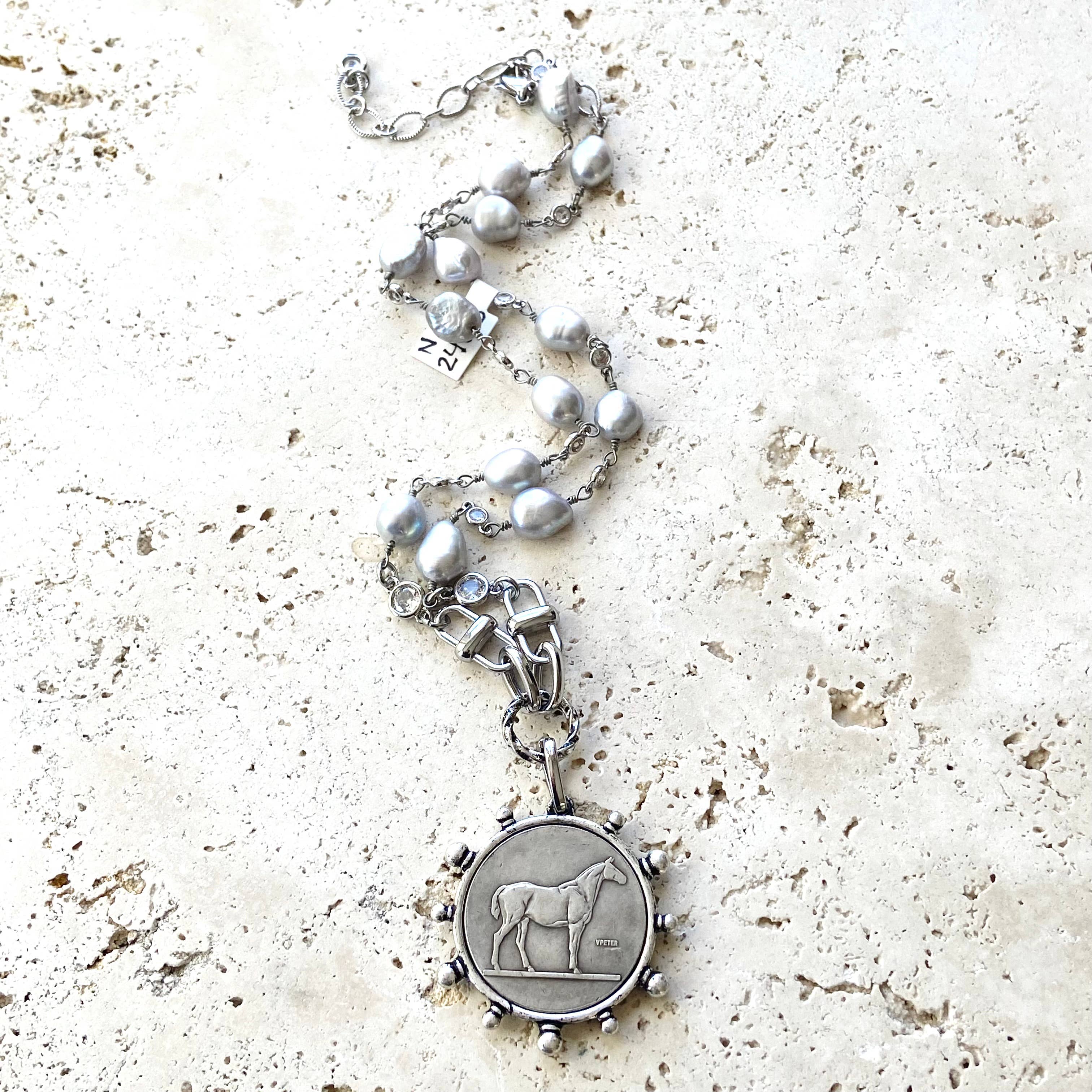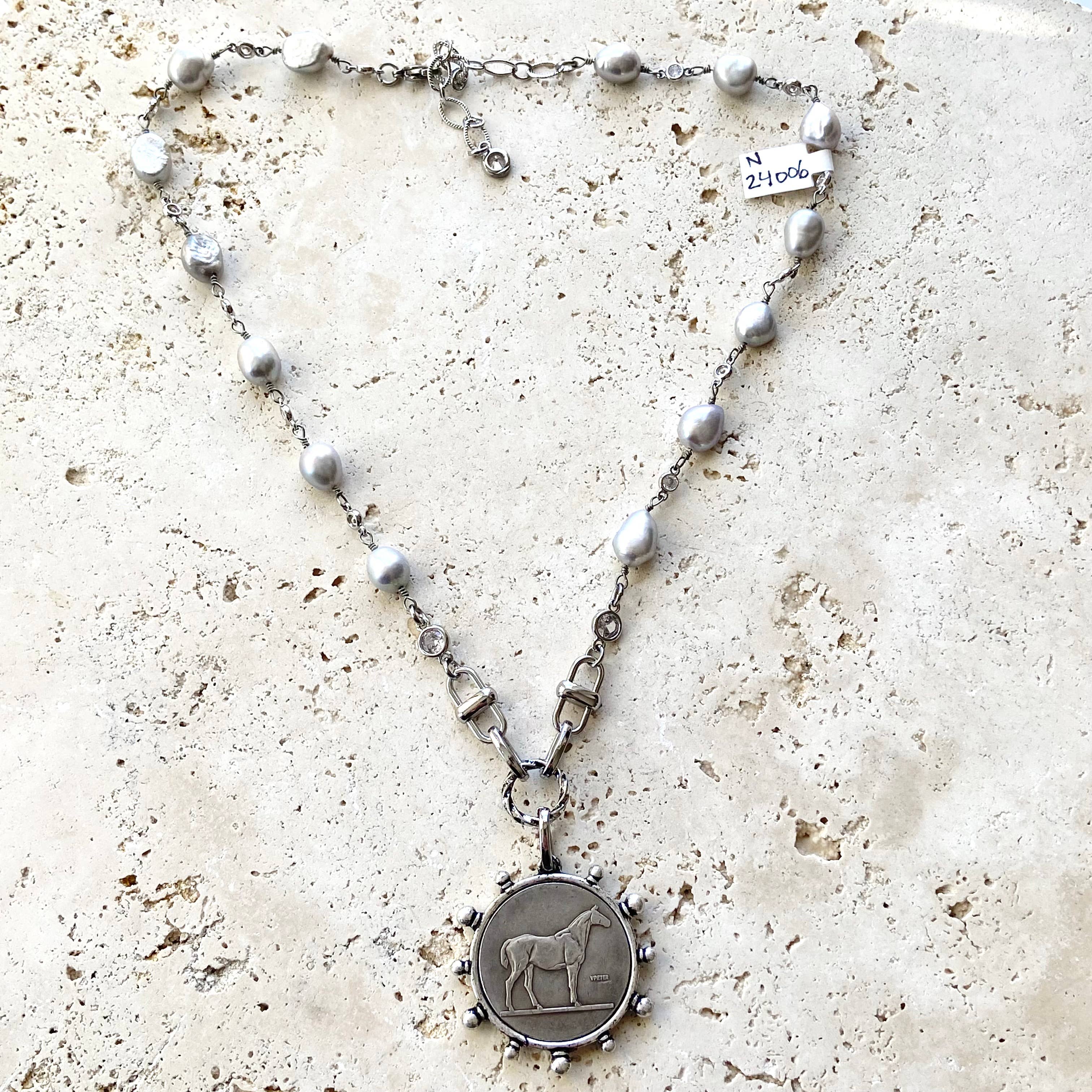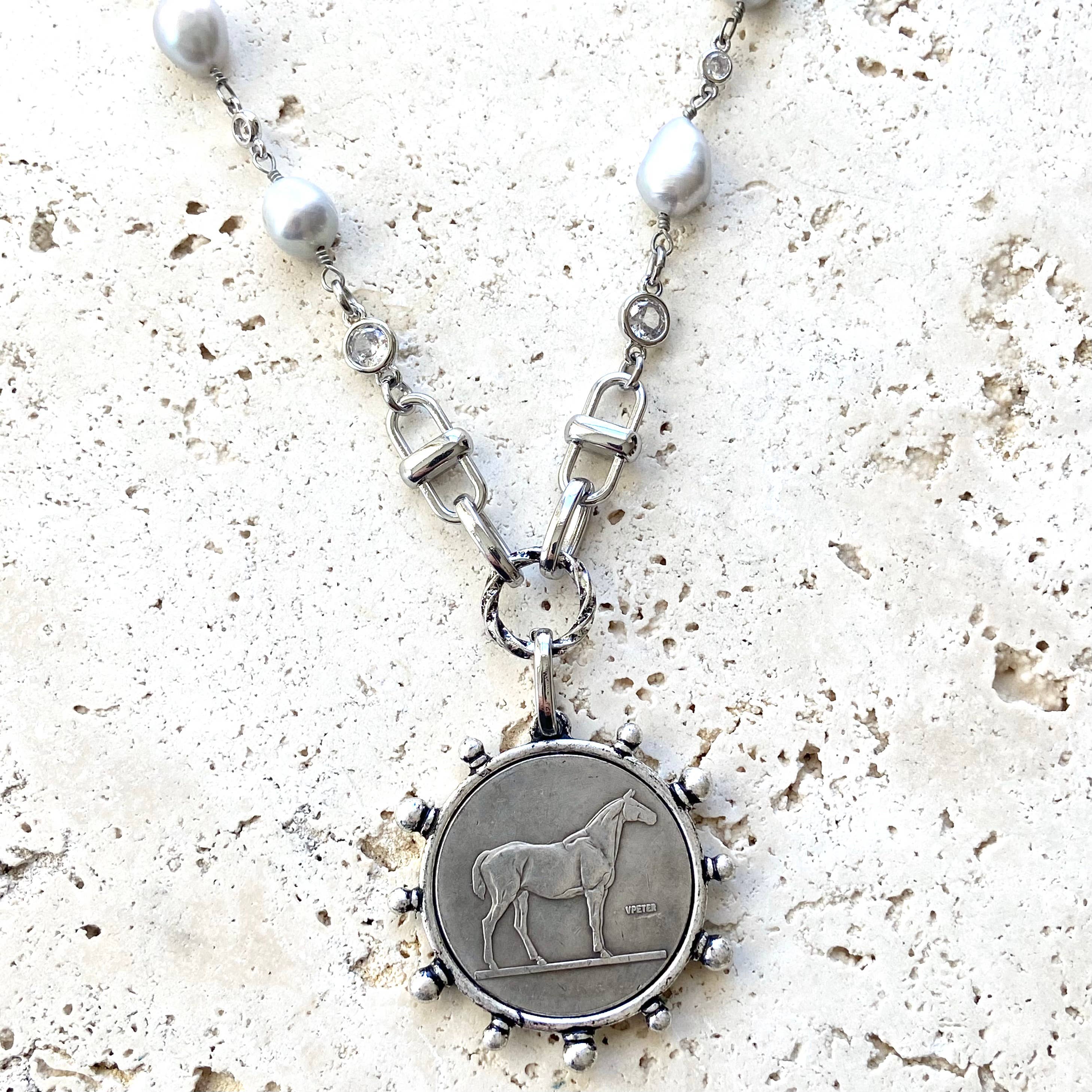 This horse coin necklace is sure going to be a Customer favorite! Mixed chain with genuine gray silver pearls and sparkly clear crystals. adjustable up to 19 inches.