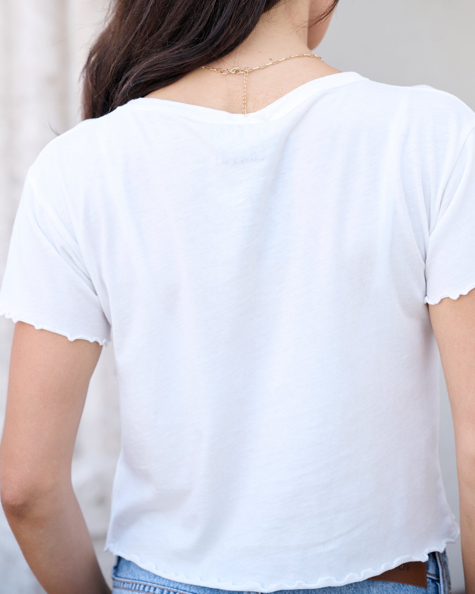 A groovy, garment-washed tee with retro "I Adore My Attitude Issue" lettering and heart graphics. Round neck. Short sleeves. Lettuce-edge cuffs and hem. Cropped length. Loose fit.
