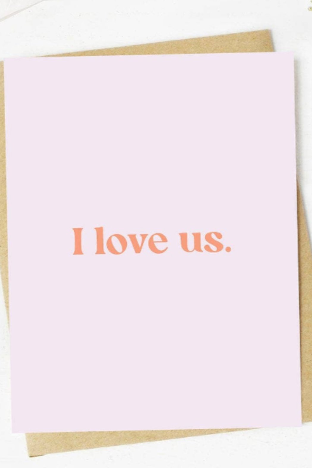 Spread sweet Valentine's wishes with this greeting card that says "I love us" -A2 Size (4.25 x 5.5 inches folded). -Printed on premium 16pt thick cardstock with a matte finish. -Paired with a coordinated kraft or holiday color envelope. -BLANK INSIDE -Hand Drawn Categories: valentine, valentine's day, valentine's day card, valentines day, valentines day card, anniversary, anniversary card, couples card, love, couples, text, lettering, minimalist cards, minimal greeting cards, couples greeting cards. Ships in 1-3 business days