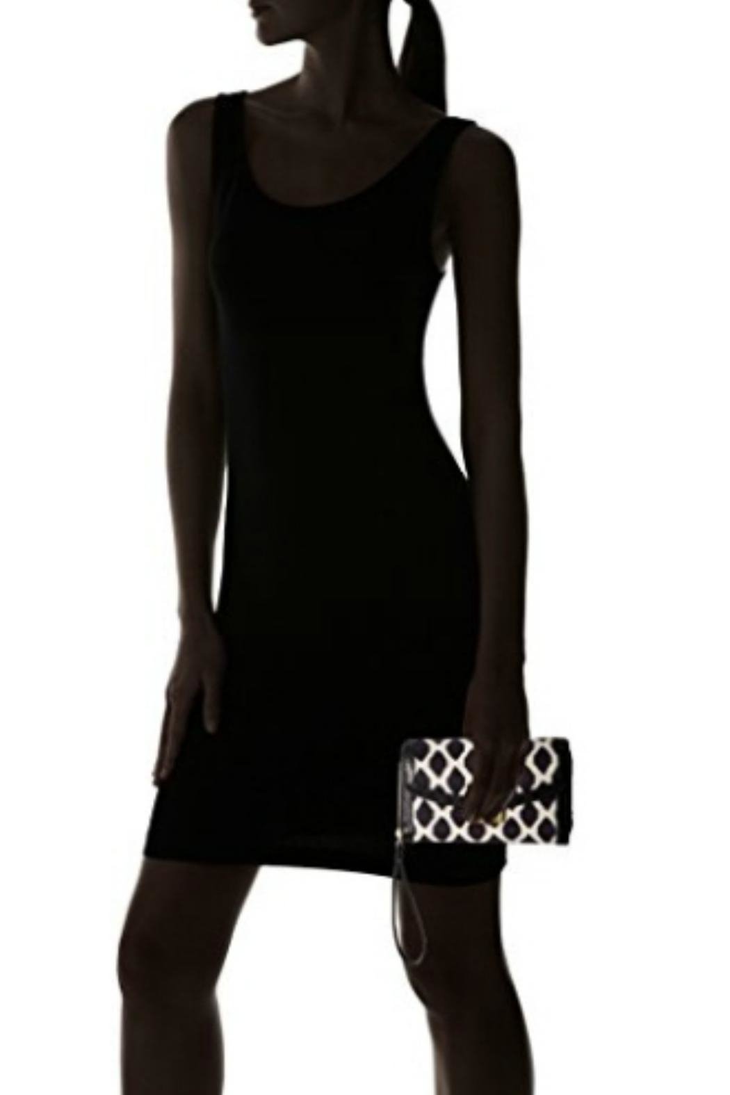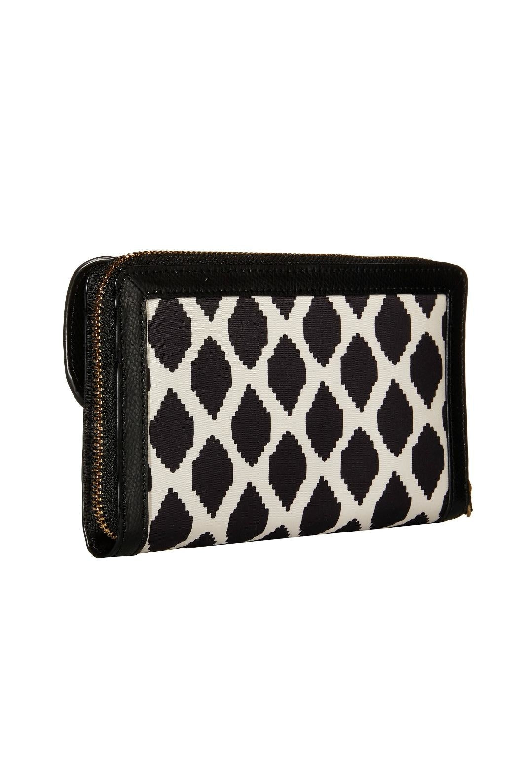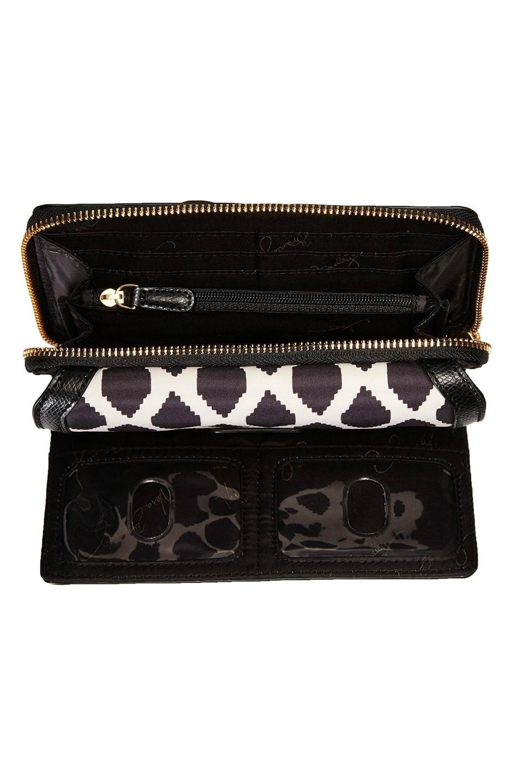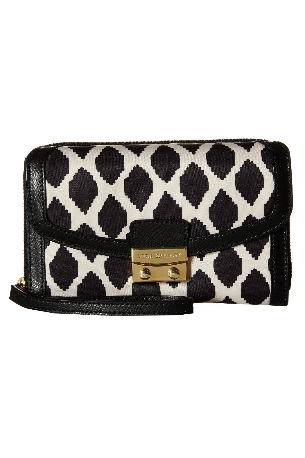 Meet the Vera Bradley Ultimate Wristlet in the Ikat Spots pattern. Stash your credit cards, cash, ID, coins, and even your phone—there's room for it all. The fabric is black and ivory; such a classic combination! The black leather trim and strap, and the gold tone hardware gives it a super classy look. The front push magnetic snap closure compartment has 10 card slip pockets, two ID windows, and a bill pocket. Zip compartment has a divided interior with one bill pocket, two pleated pockets and six card slips. Fits a phone up to 6.5". Find other bags and accessories in the Ikat Spots pattern on the "Mimi's Gift Gallery" boutique page. ------- Dimensions are 7 ¼" wide x 4 ¾" high x 1 ½" deep with a 6" leather wrist strap.
