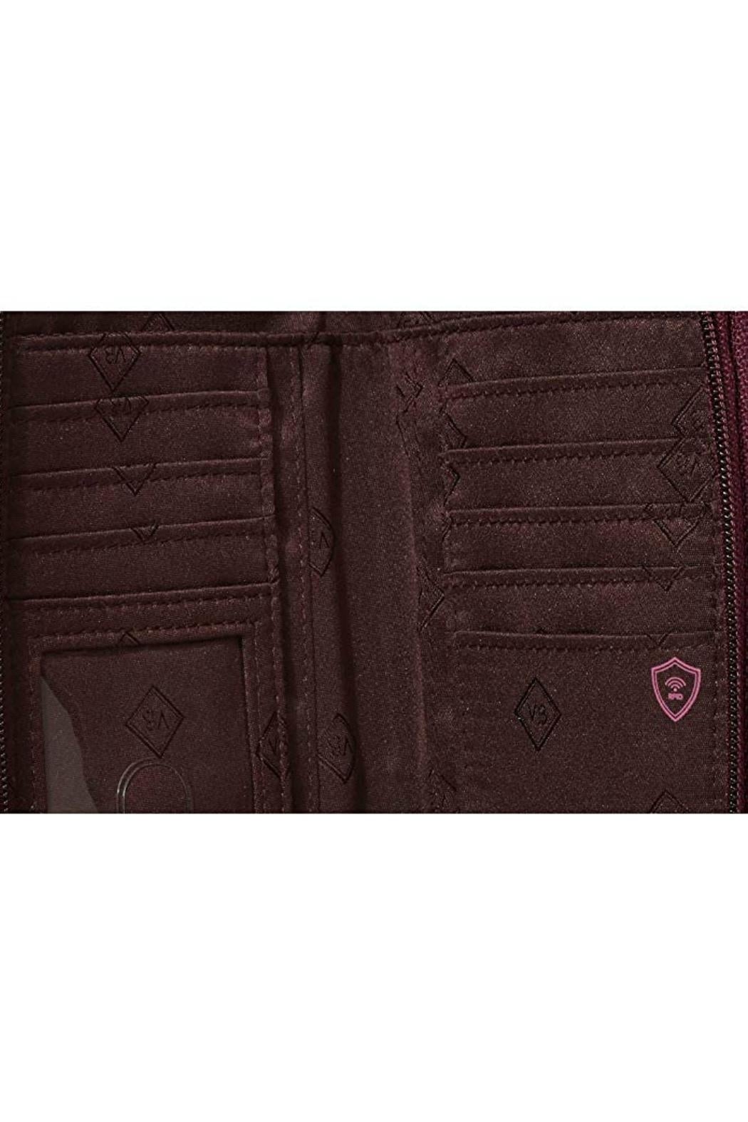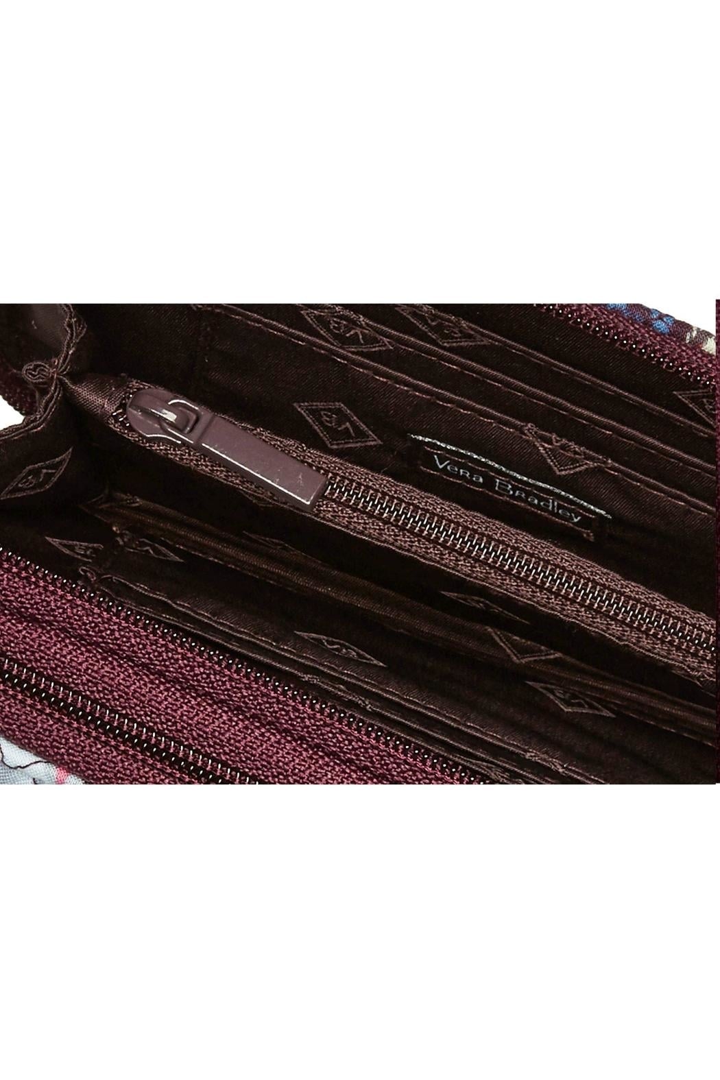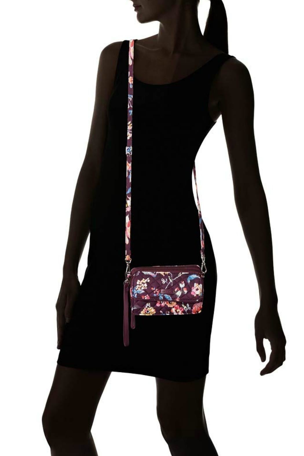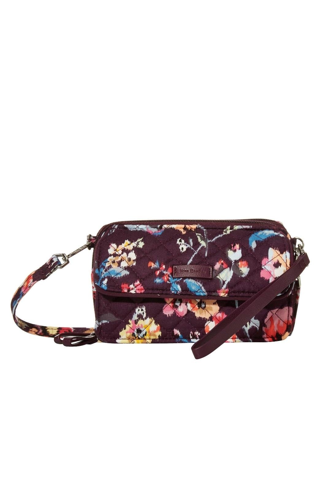 Meet the Vera Bradley Iconic RFID All In One Crossbody in the pattern "Indiana Rose". Protect your information with this RFID technology so you can have fun and stay fabulous. This little bag is designed for hands free movement with the adjustable crossbody strap, or simply hang from one shoulder, and it comes with a wrist strap allowing you to wear it from your wrist as well. Magnetic snap closure on the front exterior compartment which holds a phone up to 6.5". One zippered compartment has a built-in wallet which includes a large bill pocket, 8 credit card slips, 3 more slip pockets, and an ID window. The back zippered compartment has 2 bill pockets, two pleated pockets, 4 more card slips, and a zippered coin pocket. Pattern placement will vary, making each crossbody unique. Find other Indiana Rose bags and accessories on the "Mimi's Gift Gallery" boutique page. Dimensions are 6.5" x 4" x 2" with 52 inch removable/adjustable strap and vegan leather 7 inch wrist strap.