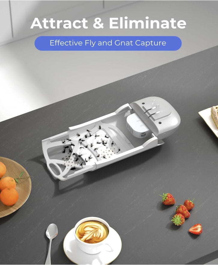 - Fly-Free, Effortlessly】The fly trap features a sturdy plug-in base with blue/UV lights (365-395 NM). Once plugged in, the light shines into the disposable cartridge, creating a glow that attracts flies, fruit flies, and gnats. The high-adhesion pad traps pests instantly—no mess, no fuss.
