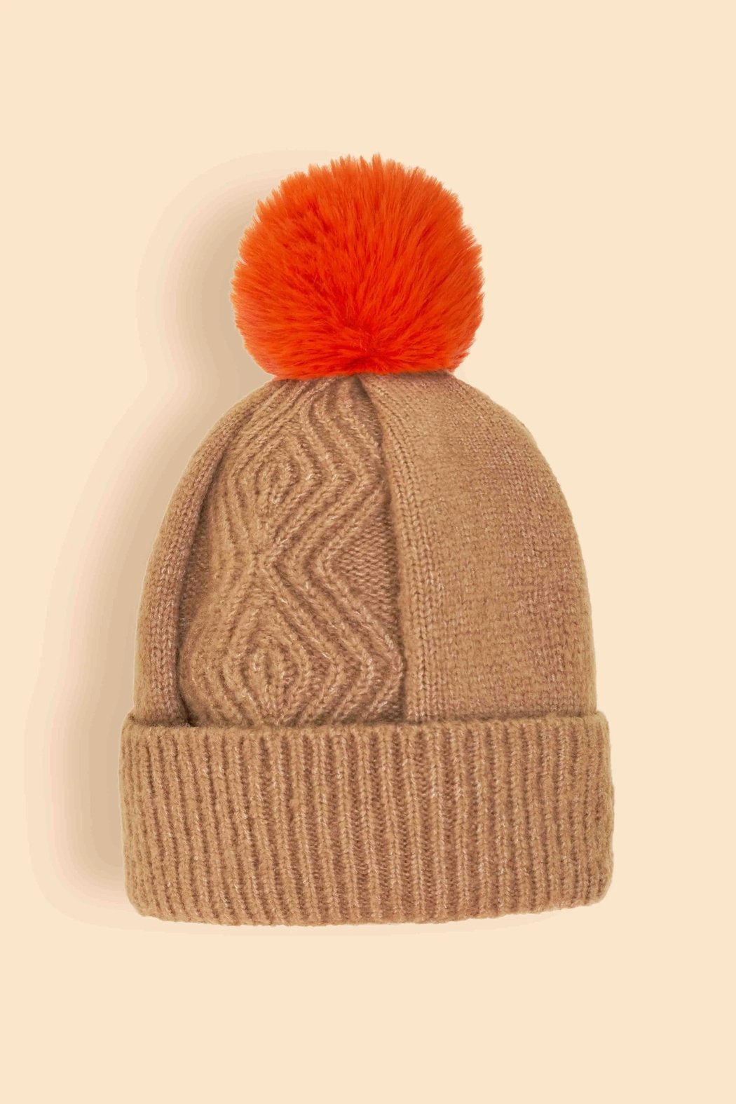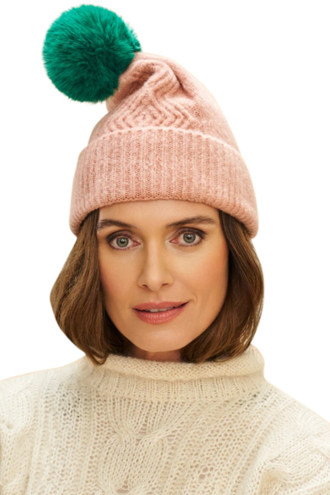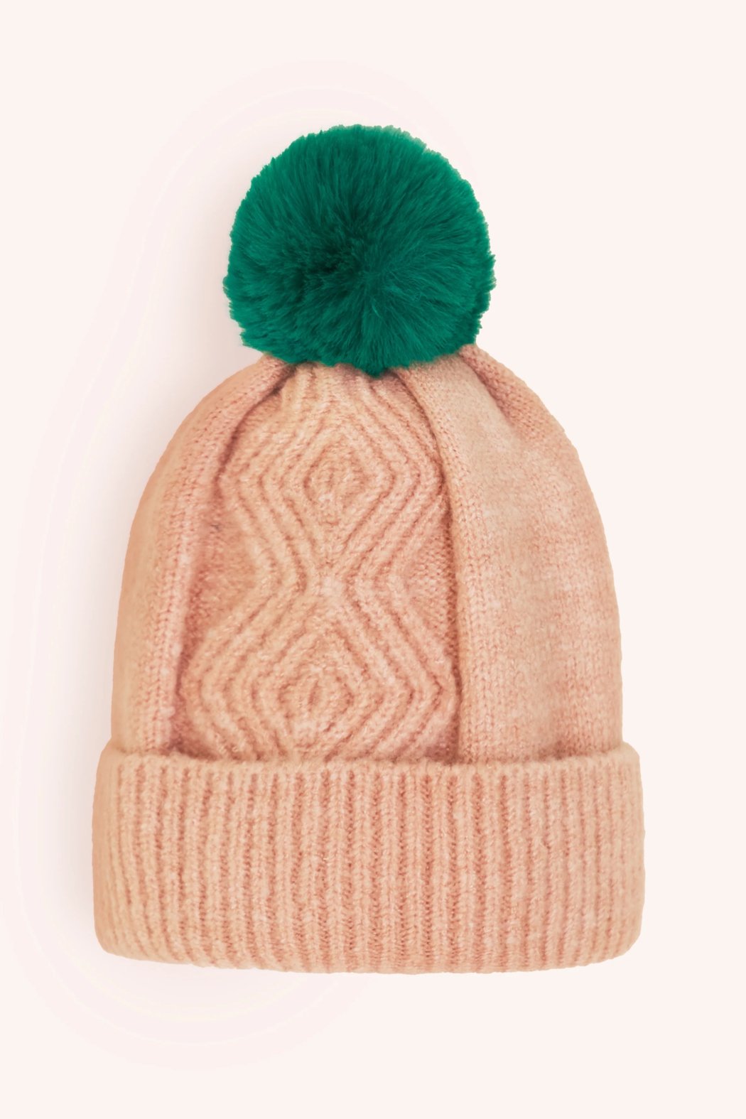 Keep warm with these gorgeous textured knit hats by Powder. Complete with a pop of color, the faux fur bobbles are the perfect eccentric flair to top off your cozy look!