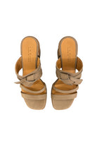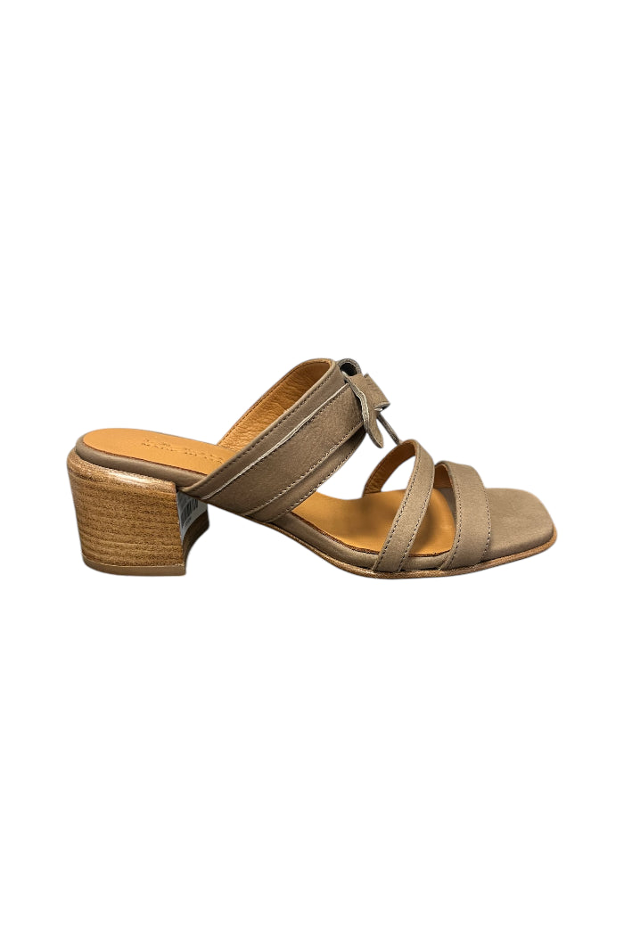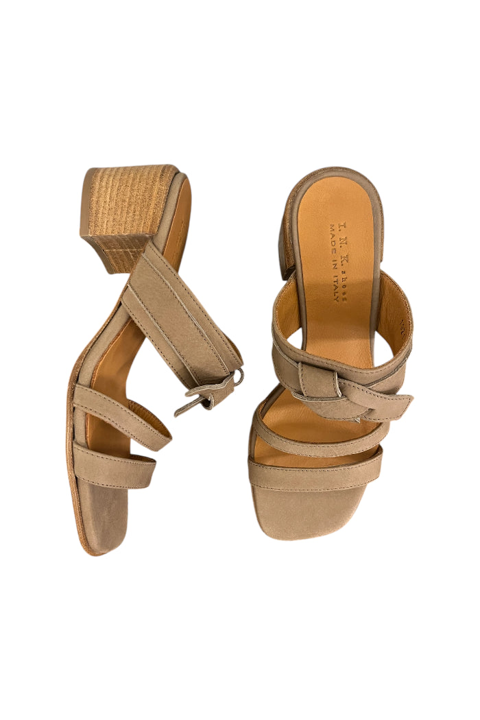 These tan leather sandals effortlessly blend comfort and style. With a wooden block heel that adds a subtle 2-inch lift, these slide-on sandals feature criss-cross detailing across the top of the foot, offering a chic and contemporary look. The open design without straps ensures ease and convenience, while the sturdy heel provides lasting support. Perfect for dressing up casual outfits or complementing a more polished look, these sandals are a versatile addition to your wardrobe.