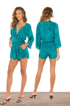 Designed by Khush Clothing under Bali vibrations, High waist bell sleeve romper, front wrap, elastic waist, side waist tie