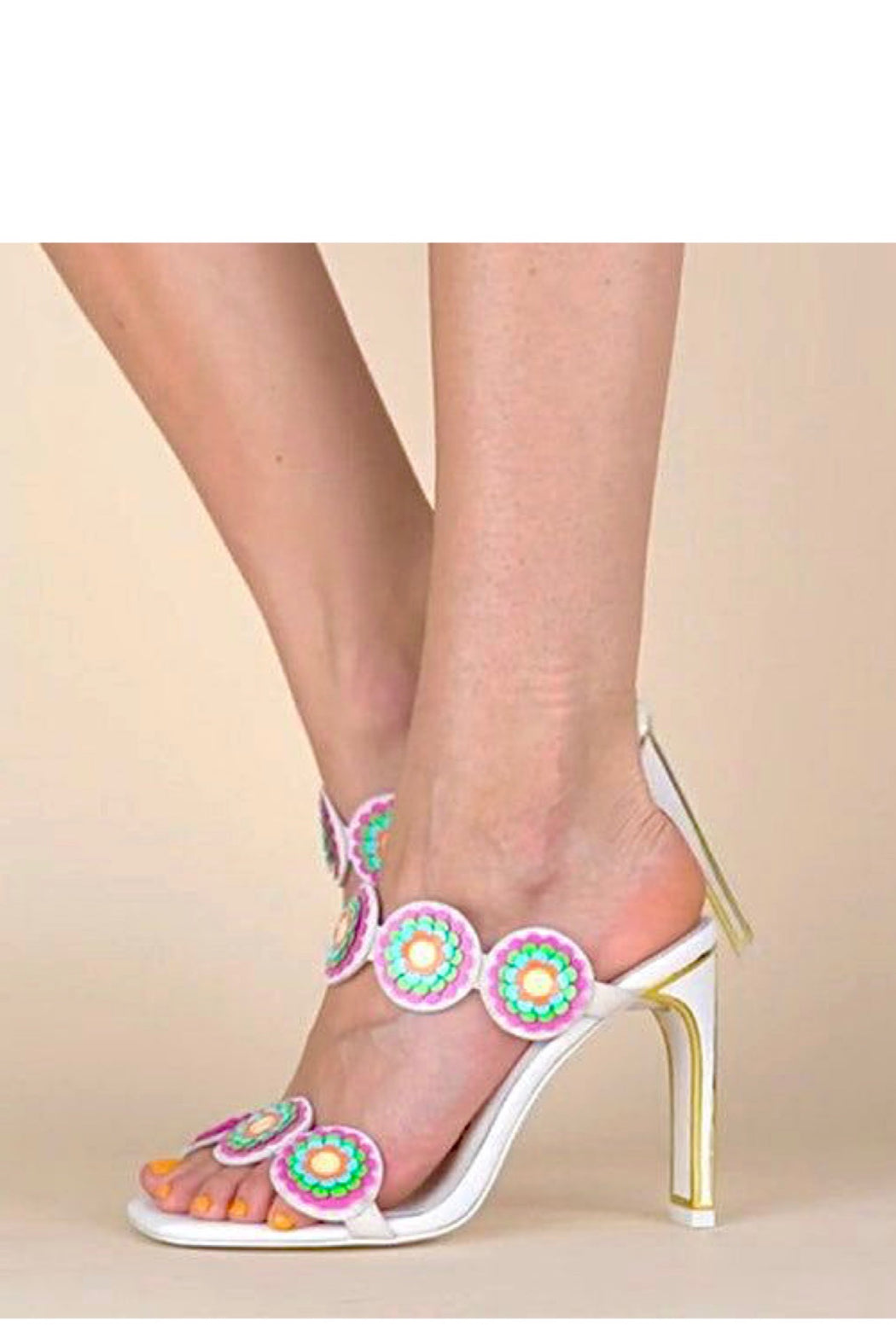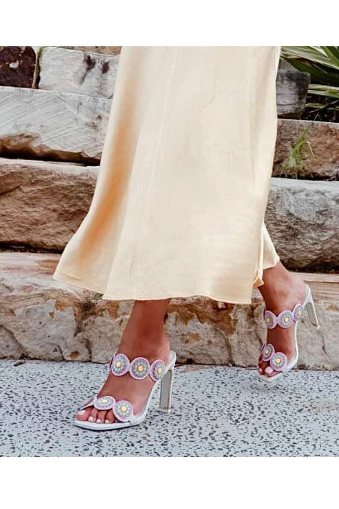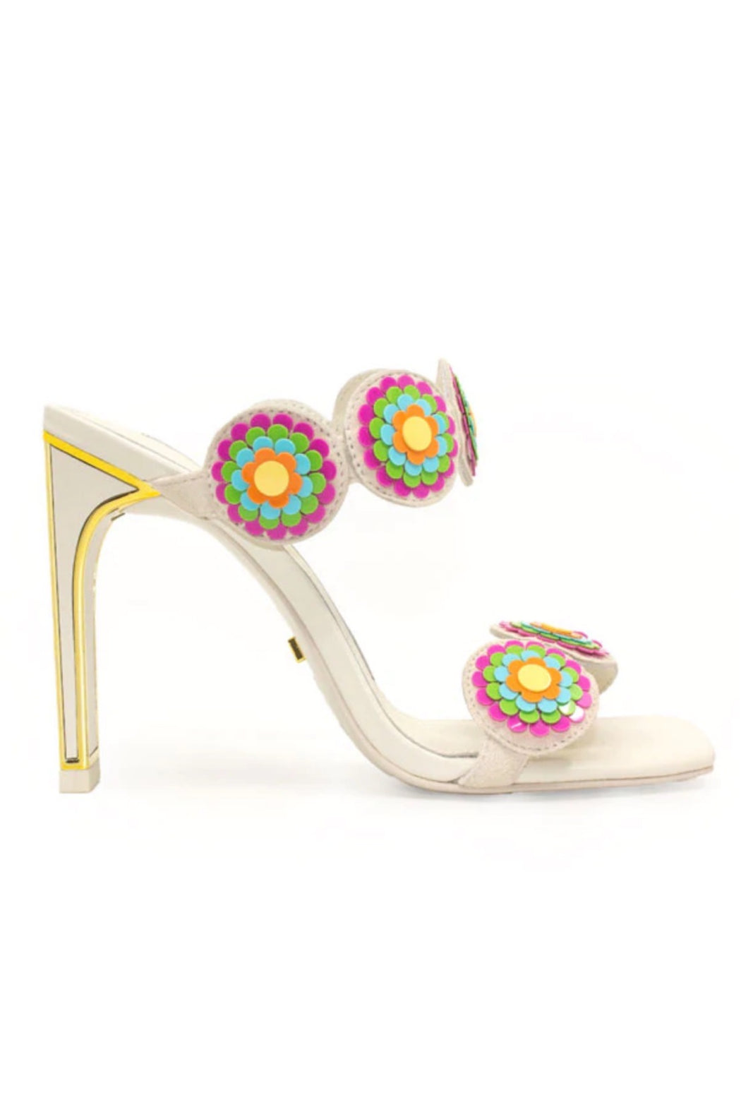 Two-strap high heel pale grey suede and white leather mule with colourful 3D floral detailing and signature Kat Maconie gold-framed heel.