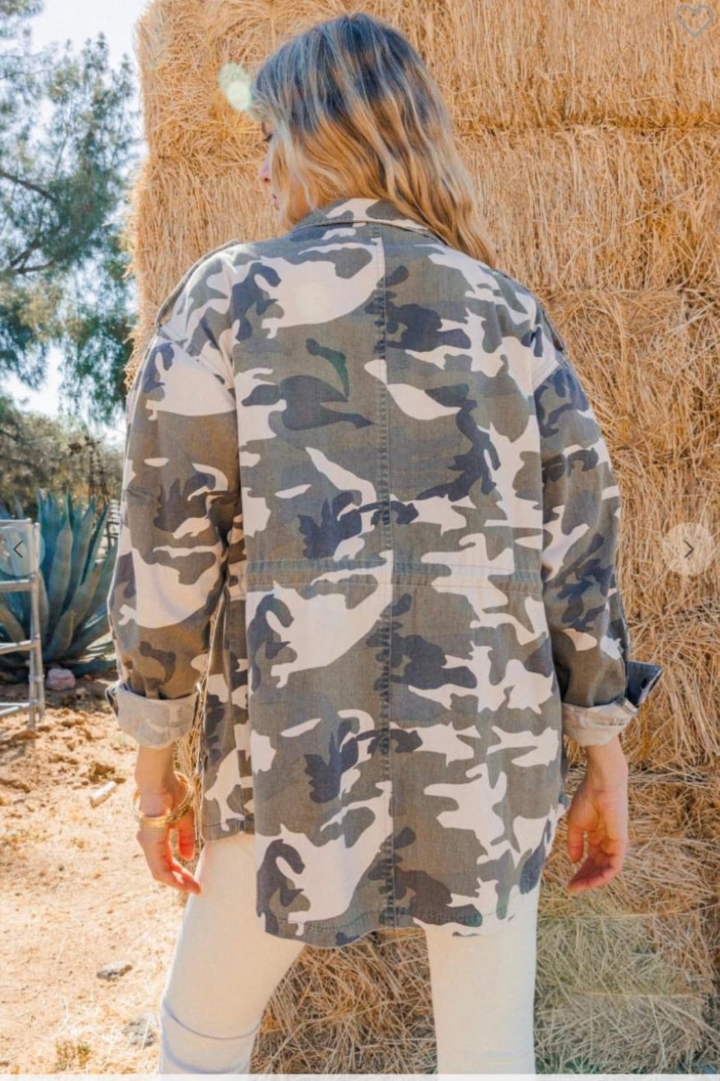 Utility jacket in cream and camo print, oversized, mandarin style collar, zipper and button closure, snap tabs on shoulders, drawstring waist tie, pockets with flap snap closure, long sleeves with snap closure. 100% cotton, non-sheer.