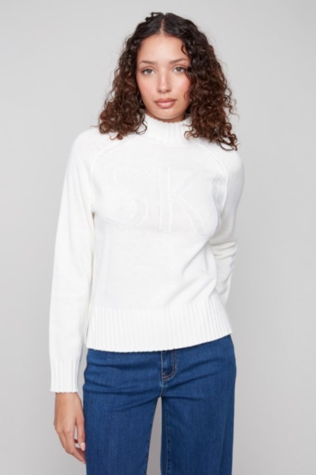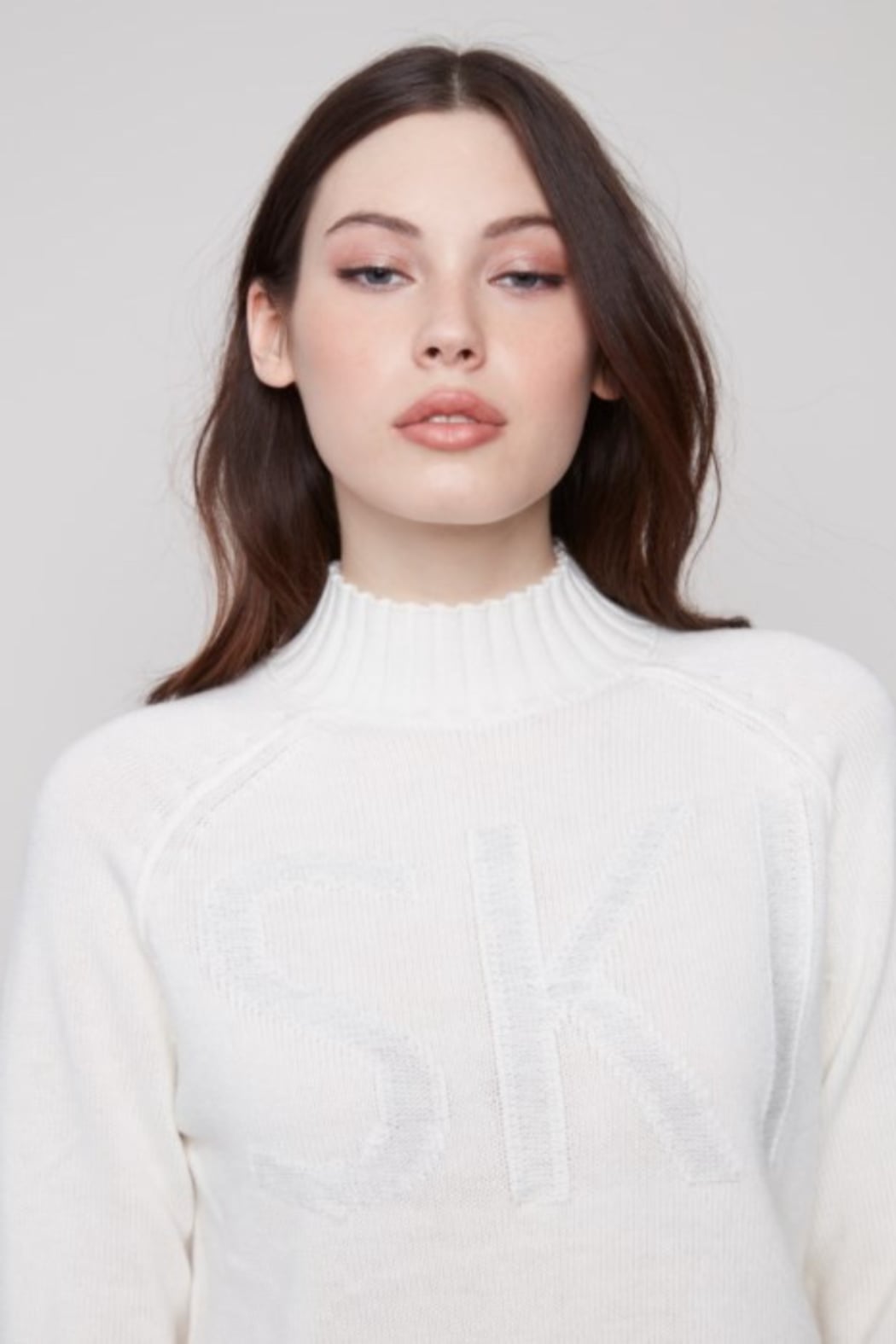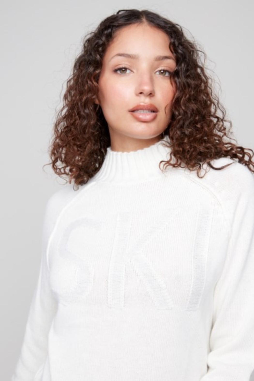 Placed Jacquard Mock Neck Sweater. Can you see the word SKI on the front and Star on the back? Adorable!