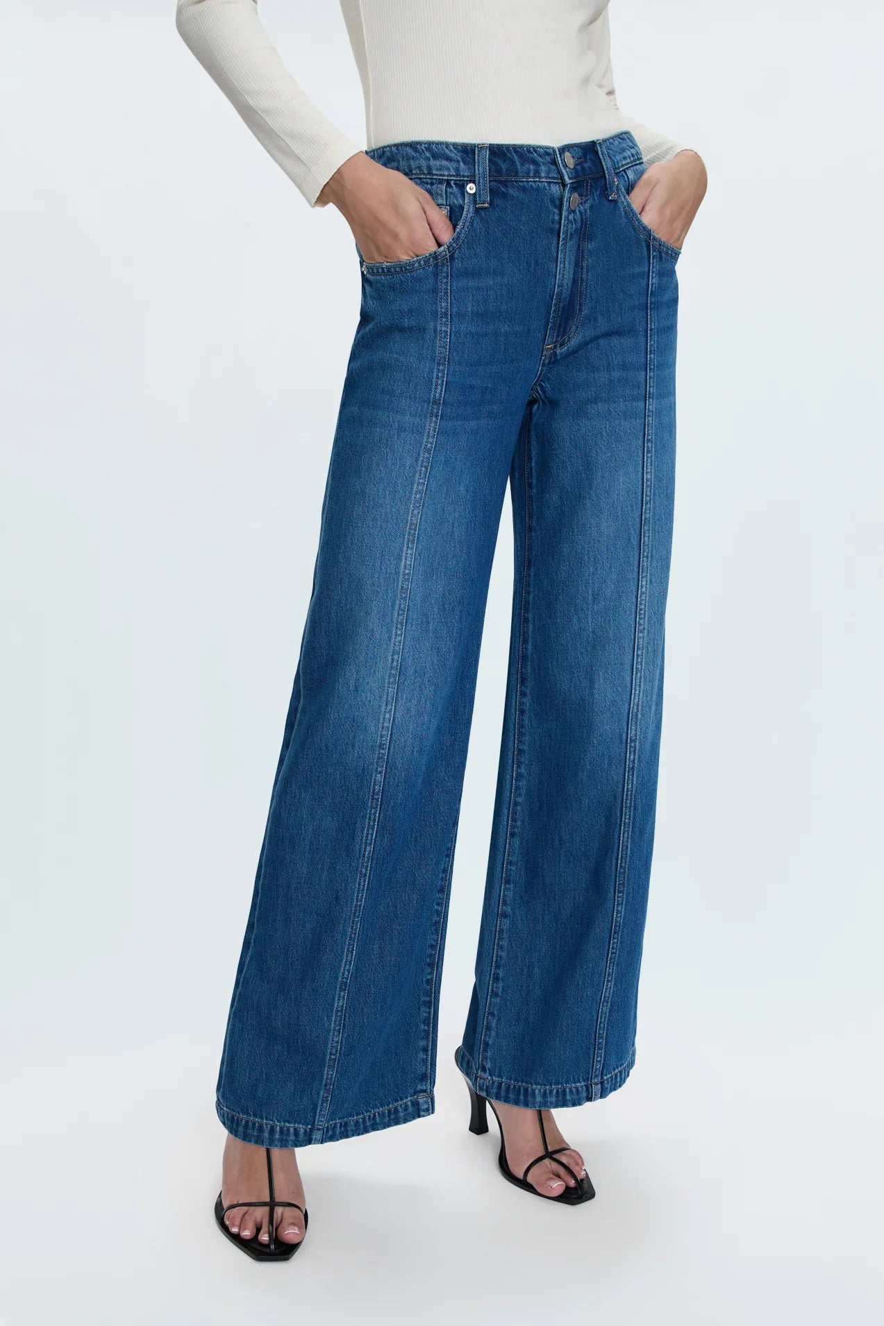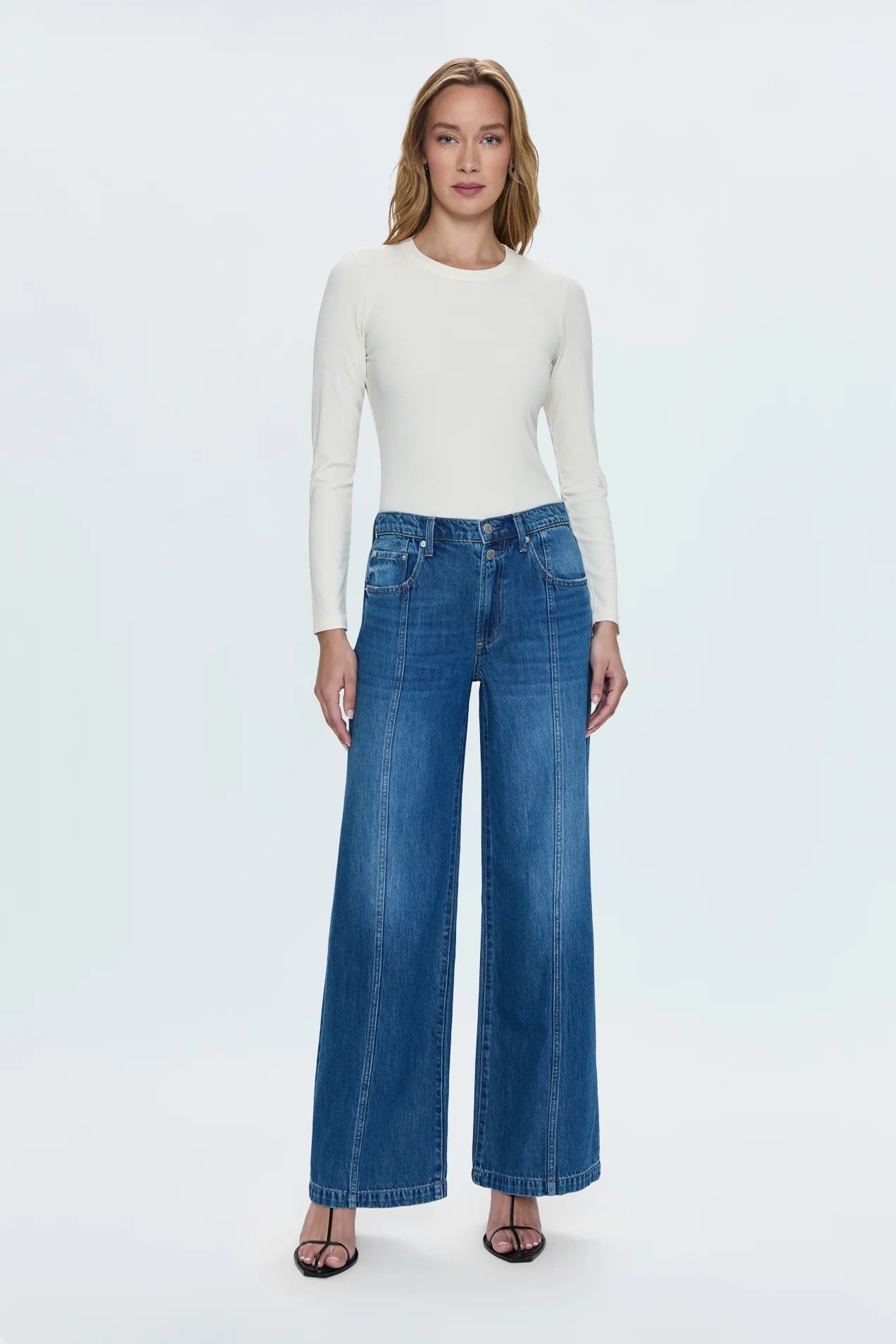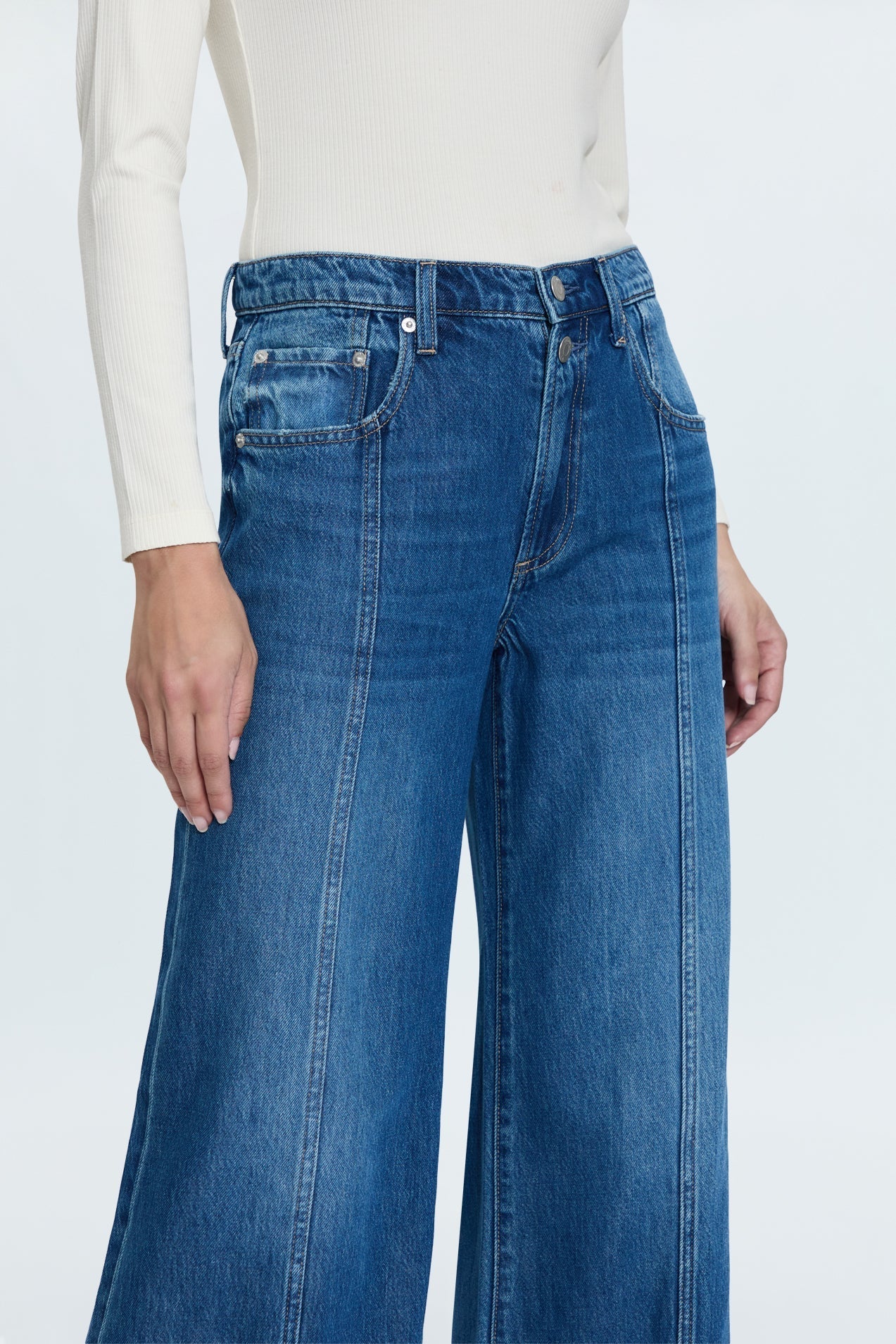 The it-girl fit. Jadyn is designed to sit low on the hips, with a relaxed palazzo leg silhouette. Crafted from a lightweight rigid denim without stretch that holds it shape. Celebration is a true medium blue denim wash with moderate fading and clean finished. Defined by it's double button waist accent and front seaming detail.