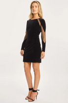 The Jana Dress is a stunning body-con silhouette crafted from luxurious black ponte fabric. Featuring long sleeves with mesh panel detailing, it adds a bold, modern twist to a classic design. The ponte fabric provides structure and comfortable stretch, hugging your curves in all the right places.