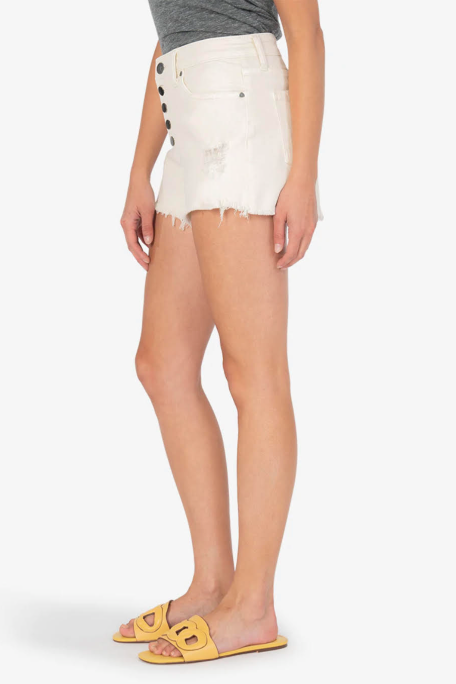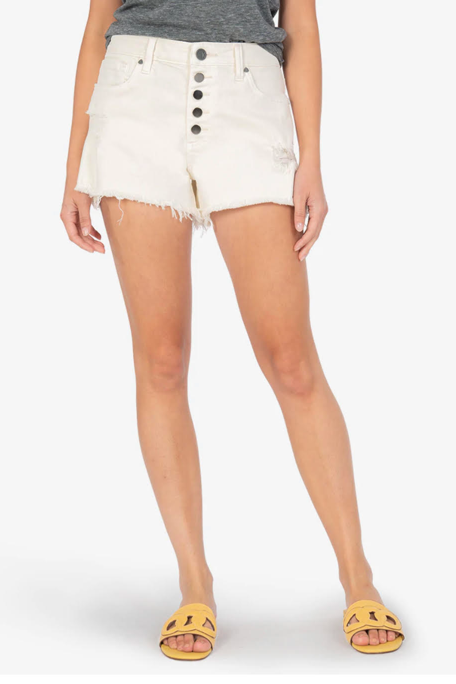 A pre-loved look and an edgy, exposed button fly define these denim cutoffs you'll wear everywhere.