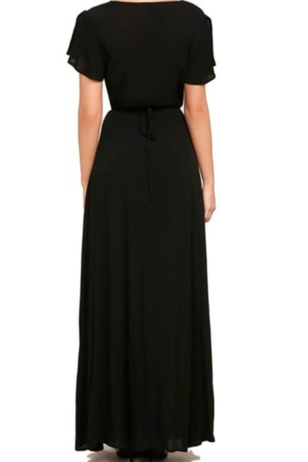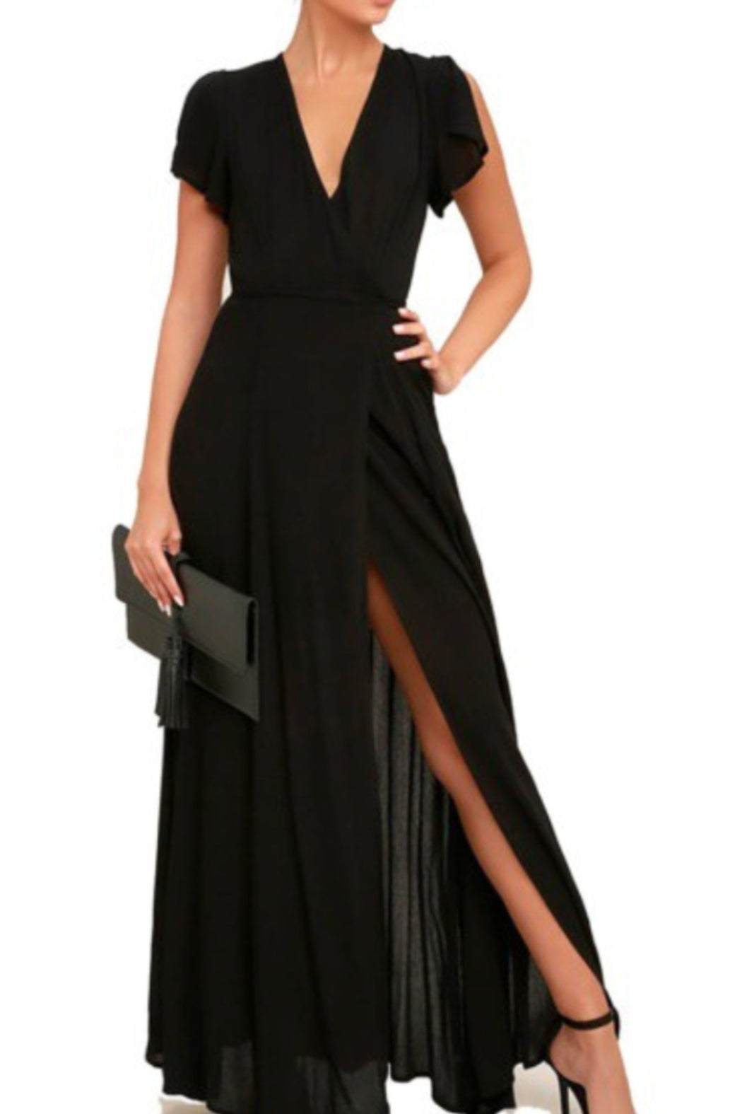 Light weight semi formal dress with high slit, v neck and slit cap sleeves