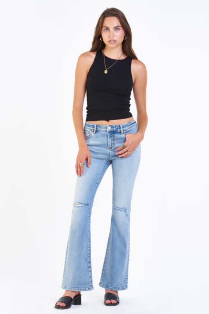 High rise bootcut jeans. It's the spirited fit that sits slightly lower on the waist and fits skinny in the hips and thigh. Full inseam on comfort stretch denim accented with hand sanding whiskers at hip, knee destructions, grindings & abrasions along pockets, fly & leg openings, washed in effortless shade for any pairings.