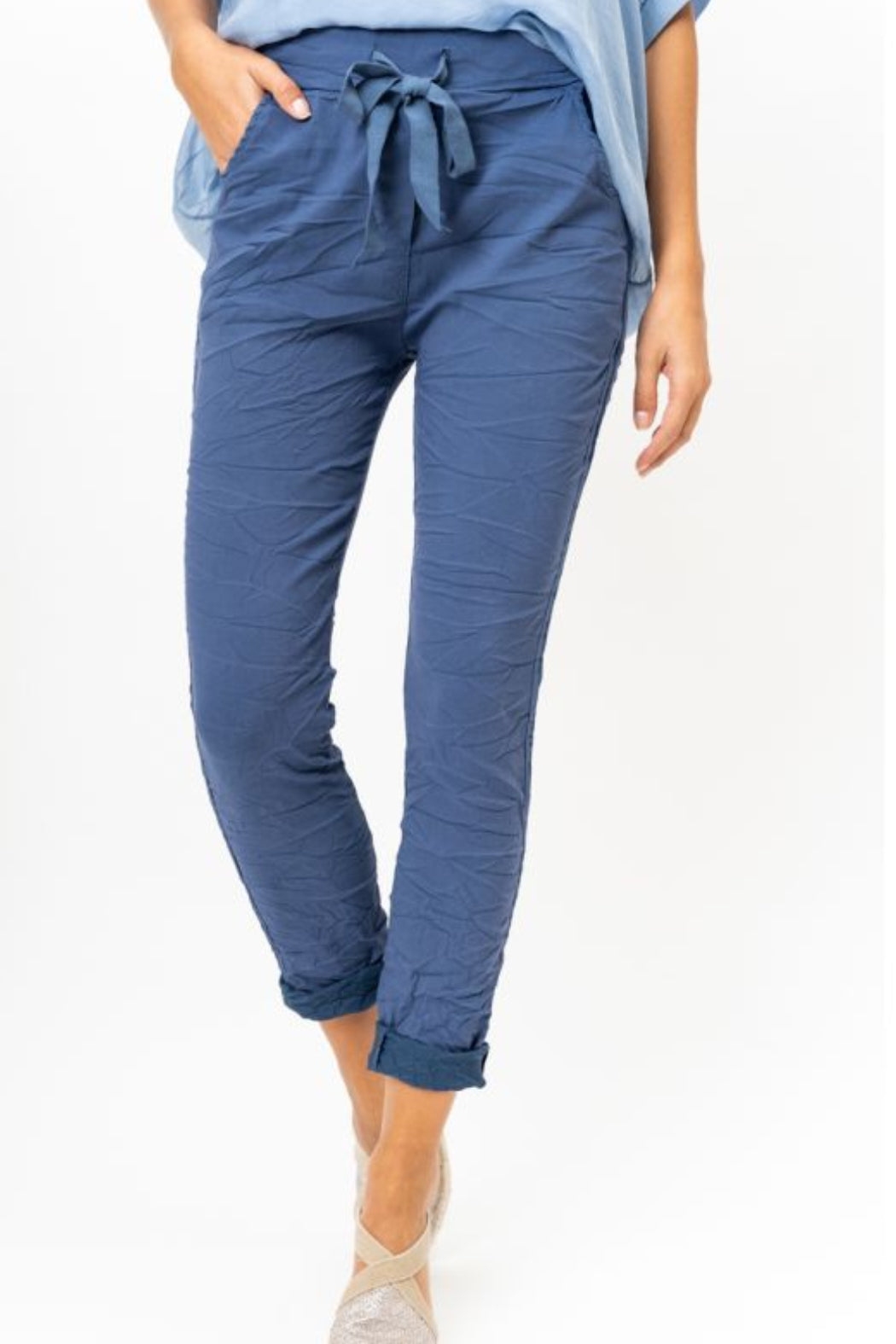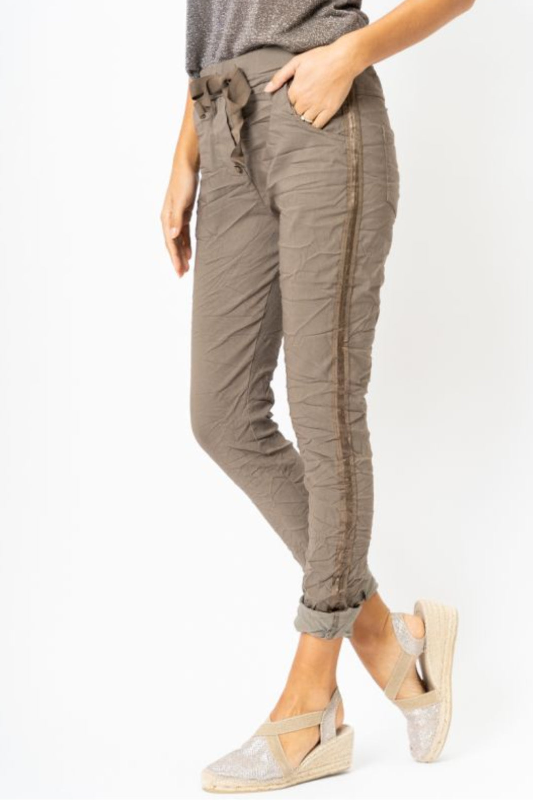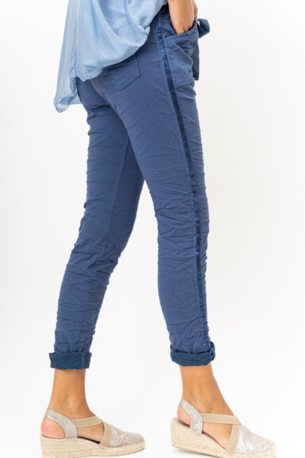 Plain Jegging w/ Ribbon Side. Elastic tie waistband, front and back pockets, ribbon on side seams.