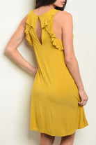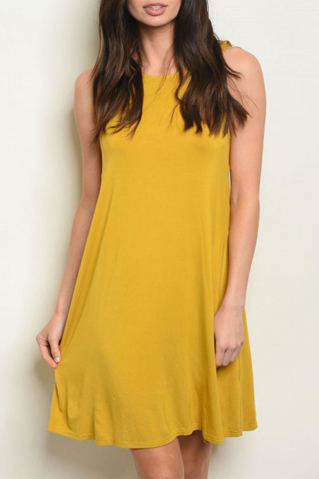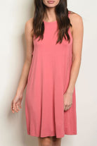 Sleeveless scoop neck jersey tunic dress. Description: L: 35" B: 32" W: 36" Color comes in CORAL and MUSTARD.
