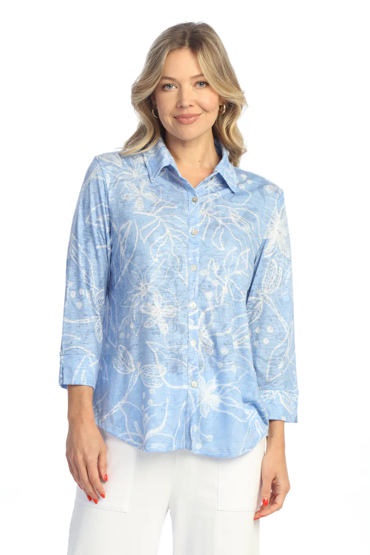 Classic button front styling, this "Darling" blouse by Jess and Jane is a soft fabrication in sky blue with a tasteful spring and summer print of florals and dragonflies. 3/4 length cuffed sleeves and rounded hemline complete this serene blouse. Made in the USA
