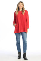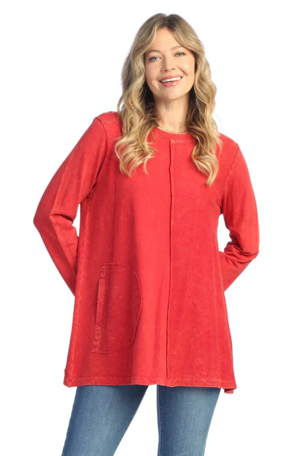 Add a touch of cozy charm to your fall style with this Jess & Jane tunic. Crafted from soft 100% cotton French terry, it features a mineral-washed finish for a naturally lived-in look that’s ideal for cool autumn days. The playful contrast round pocket adds a fun accent to its relaxed fit, making it perfect for layering or wearing on its own. Ideal for pumpkin patch outings, bonfire nights, or laid-back coffee dates!
