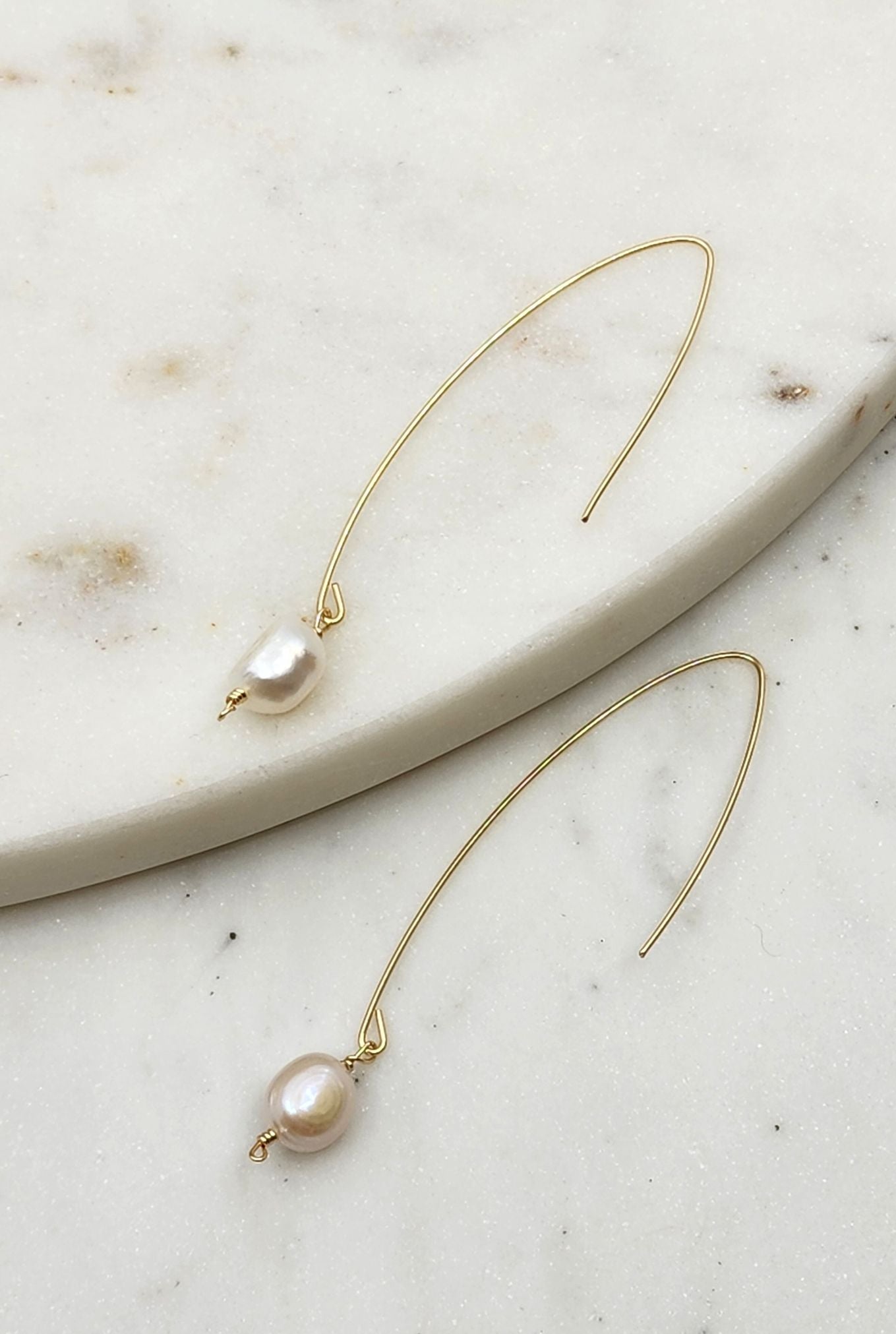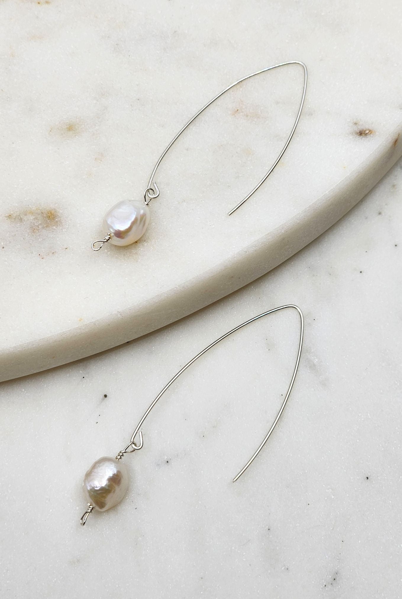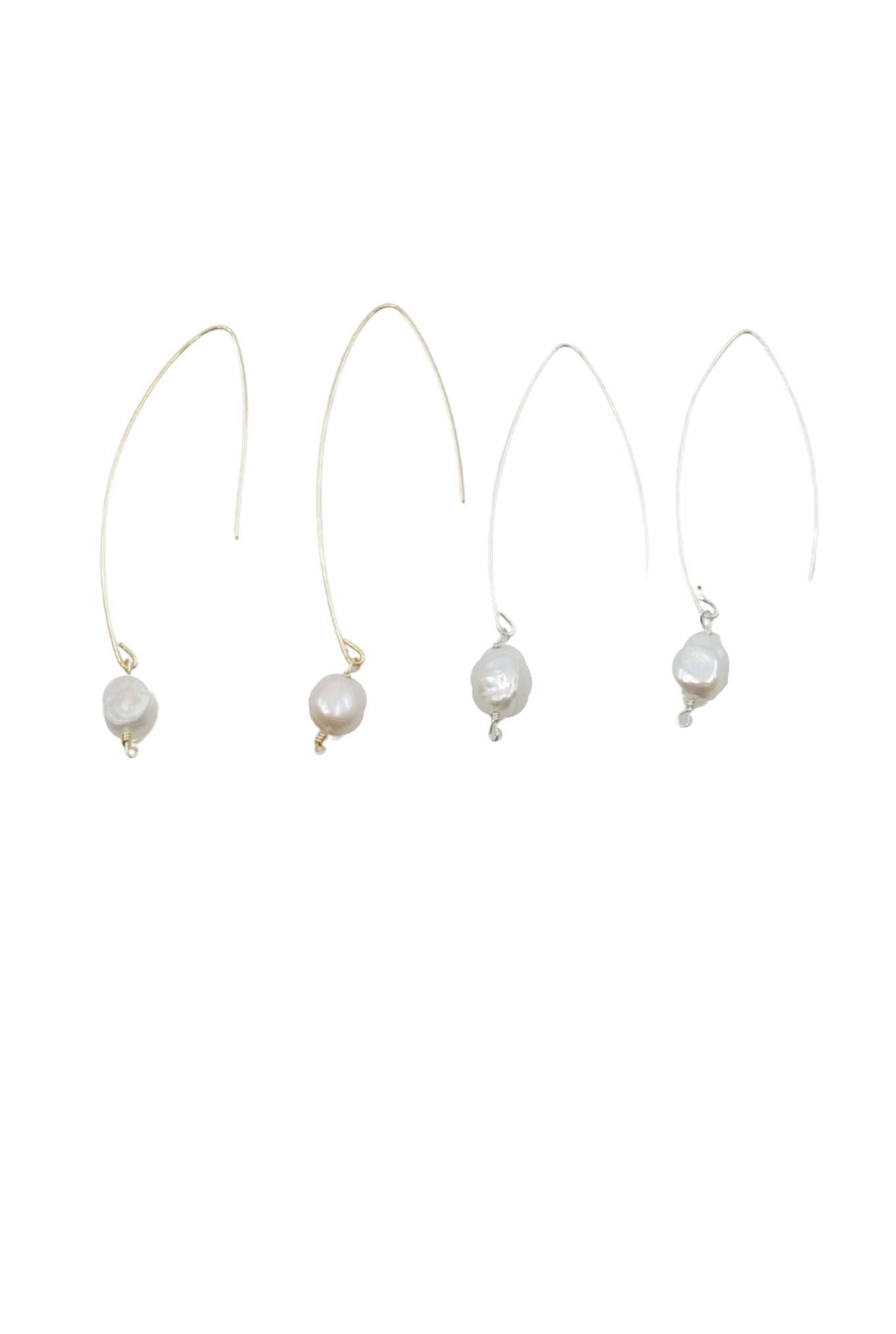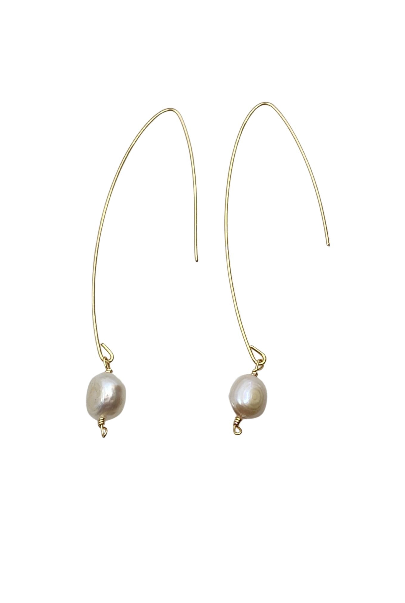 Gold or silver long wire drop earrings with a hand-wrapped 9mm Pearl.