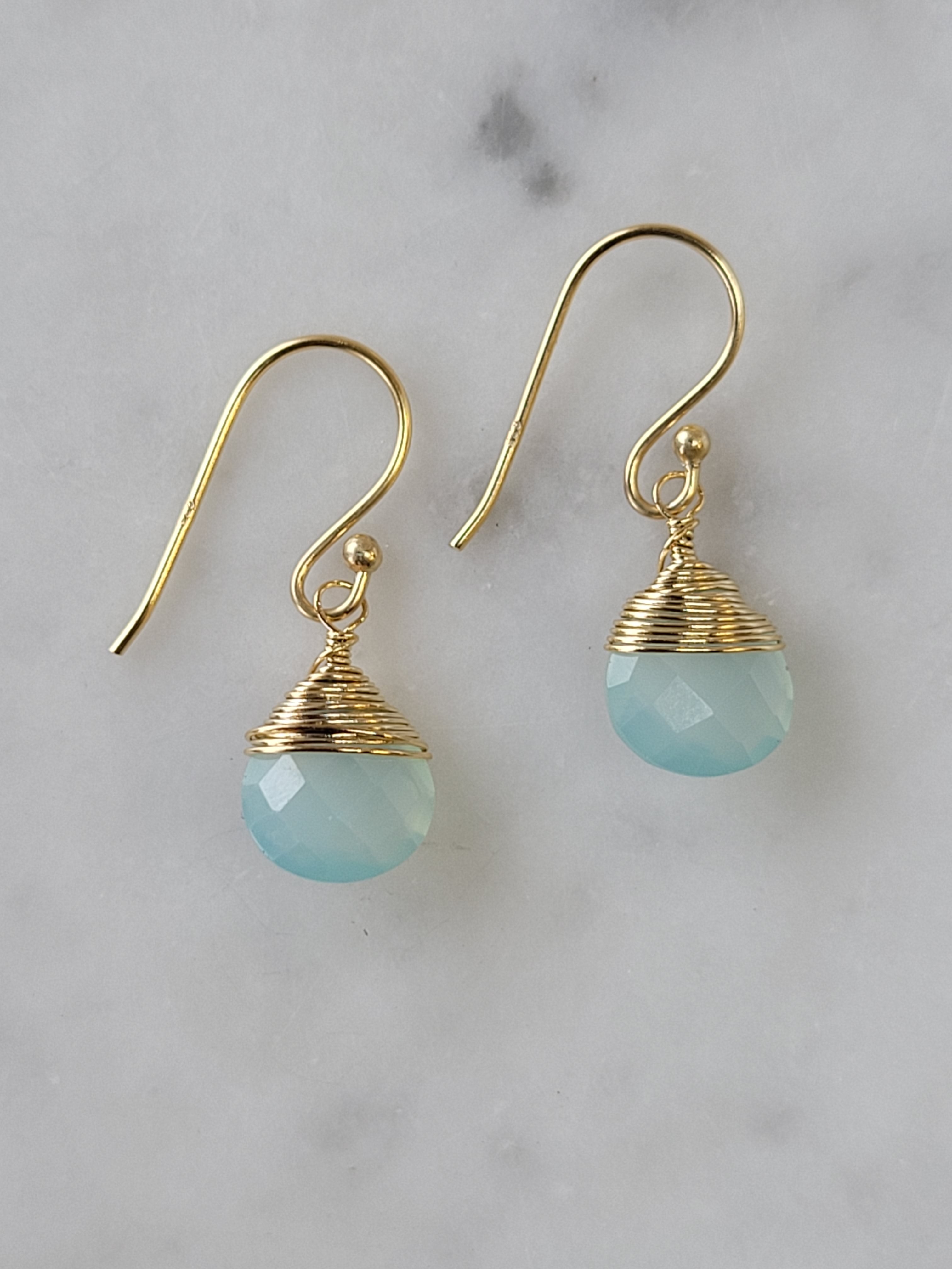Gold or silver dangle earrings with a hand-wrapped Chalcedony drop stone.
