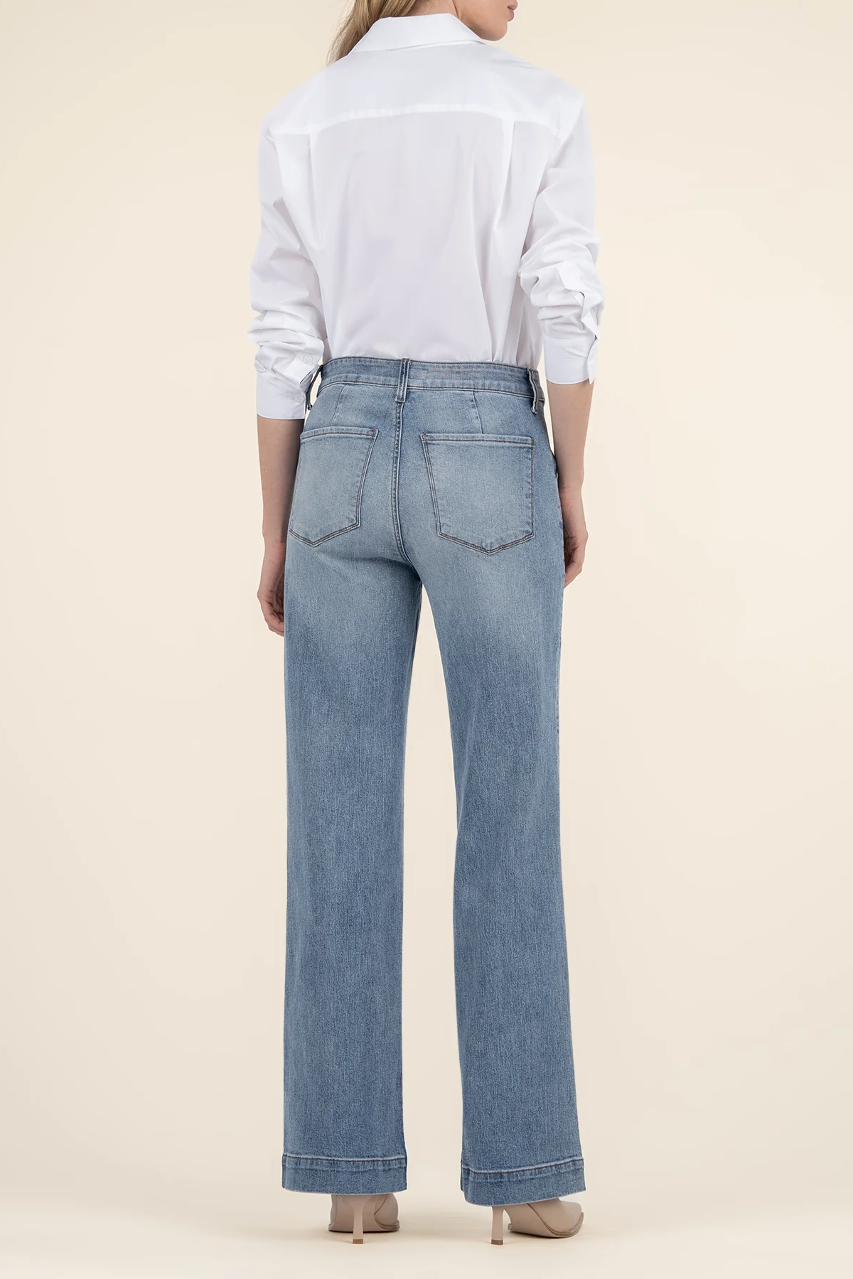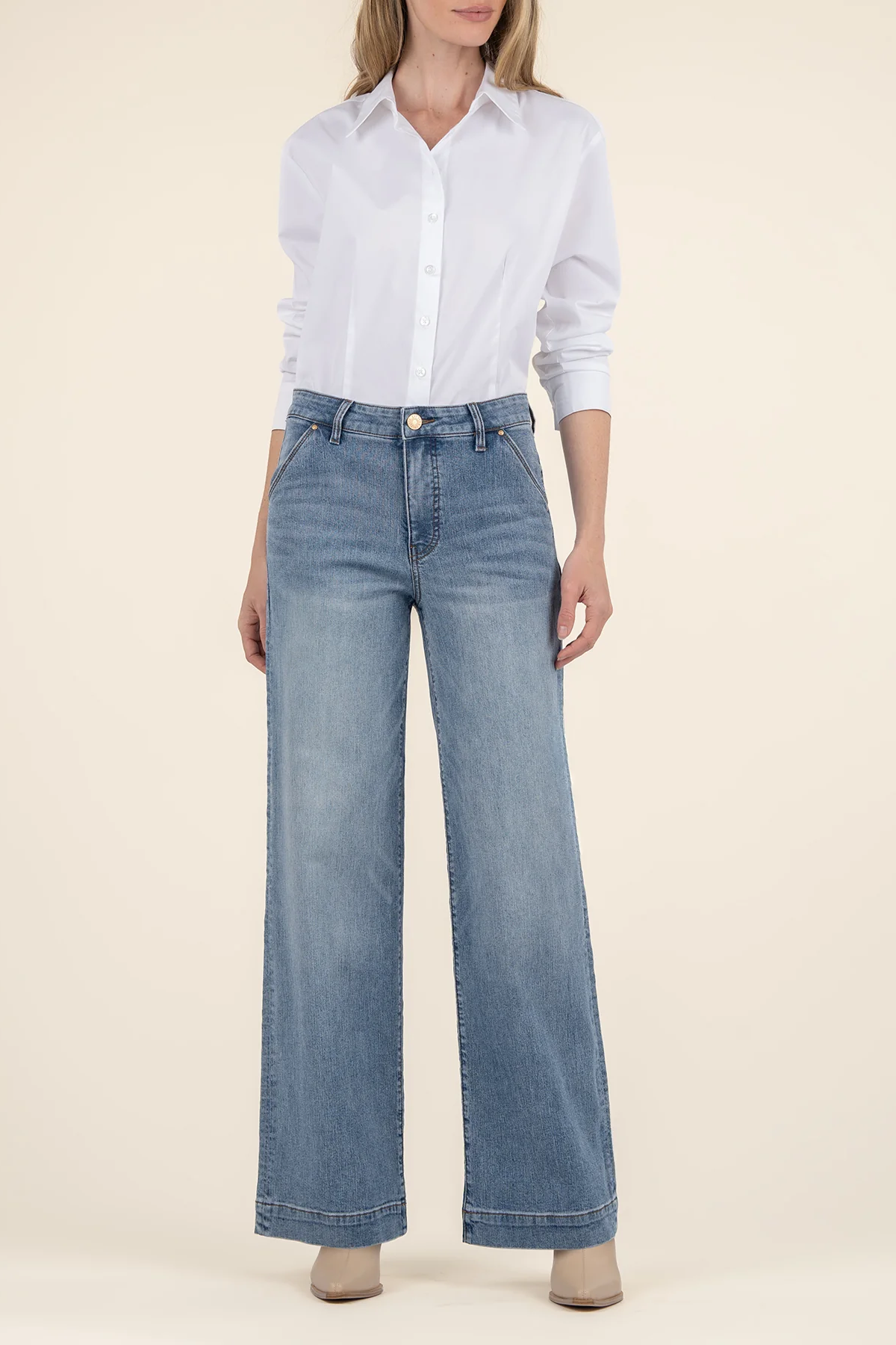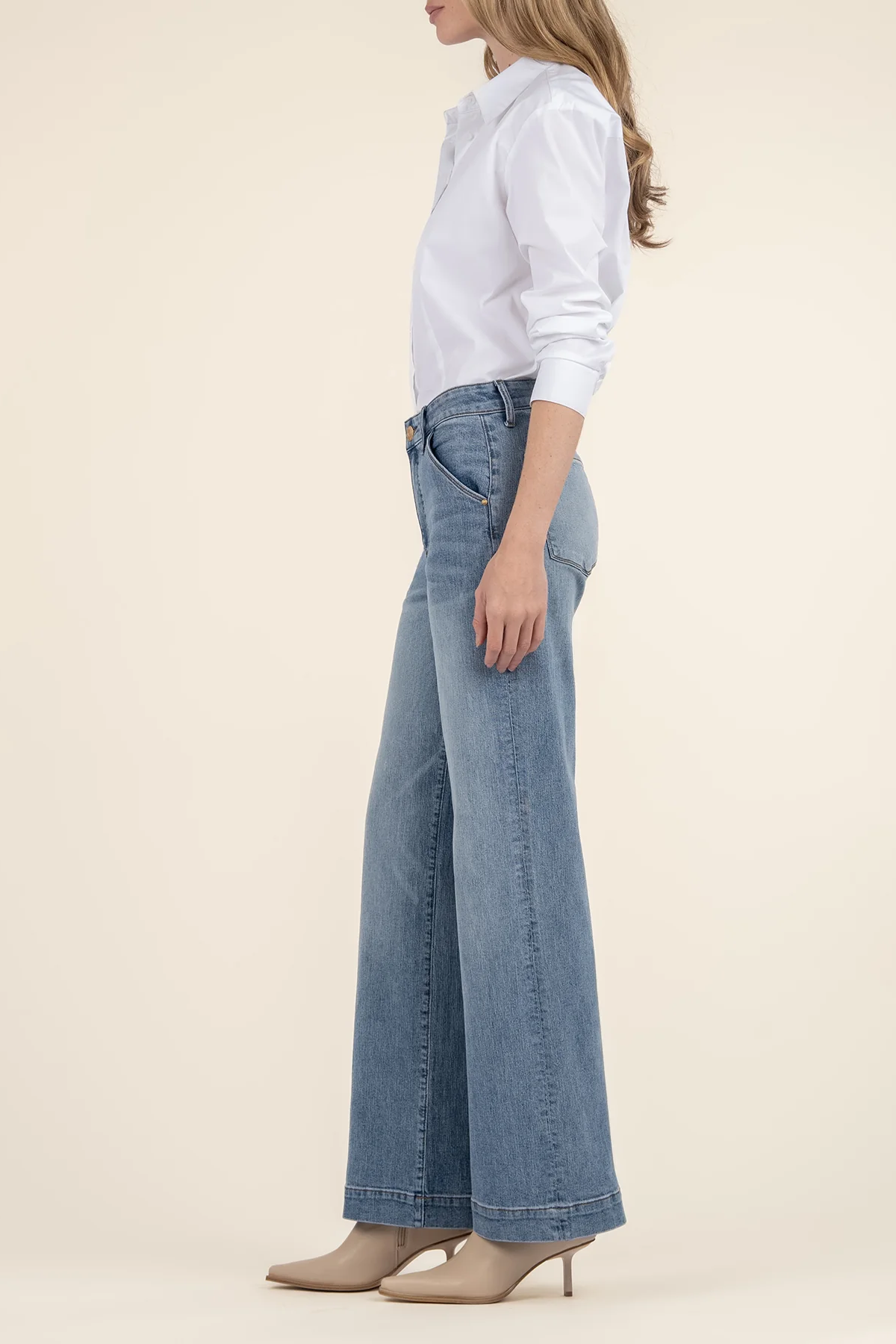 These high-rise Fab Ab must-have wide-leg jeans with slash front pockets provide a sleek silhouette and effortless style. A perfect mix of fashion and functionality for your everyday look.
