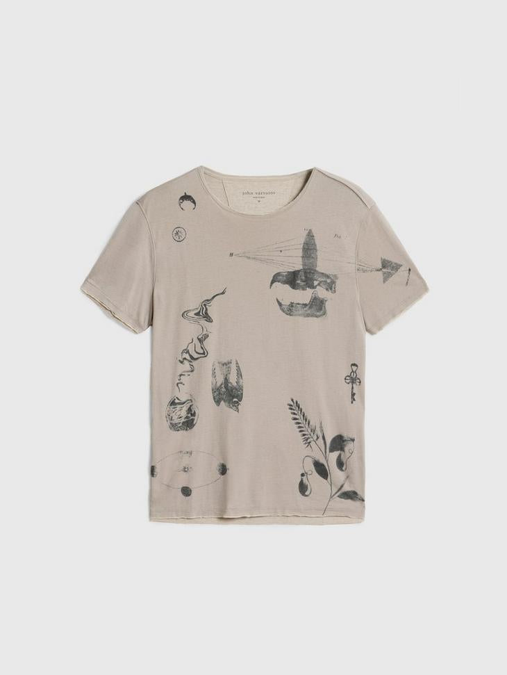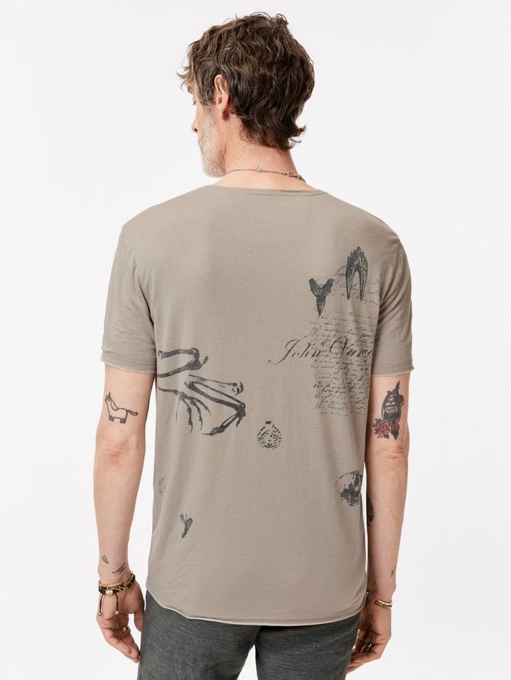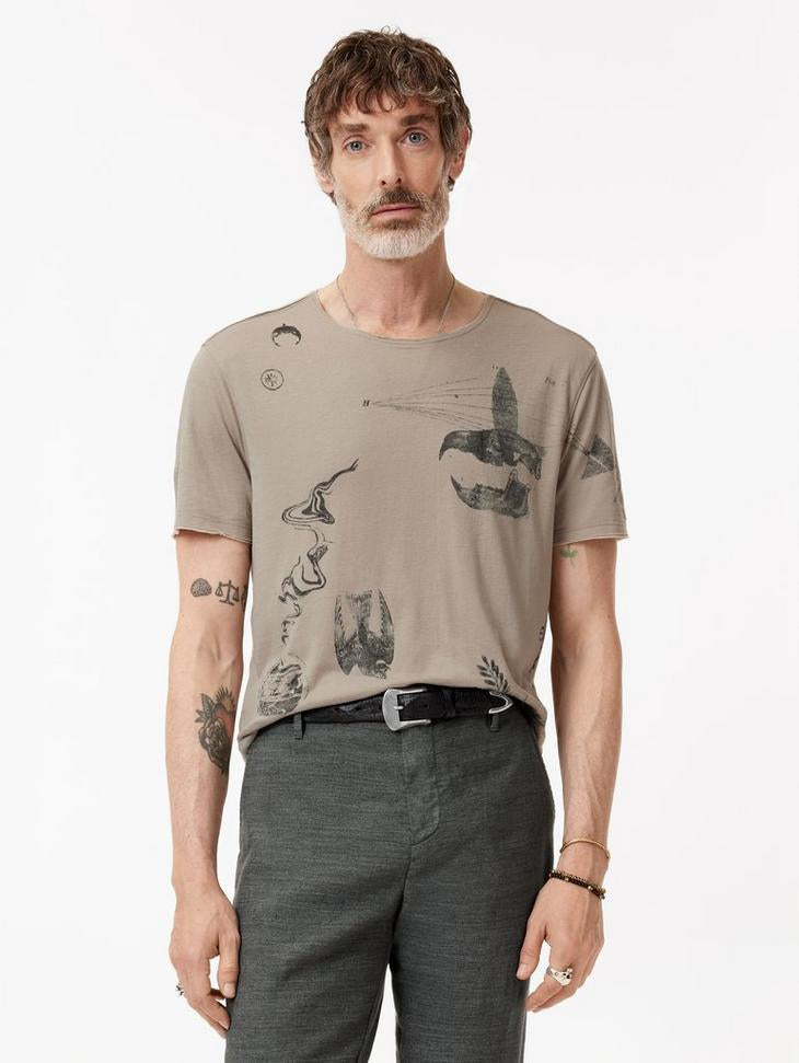 Introducing our John Varvatos Double Layer Tee! Made with ultra-soft burnout fabric, this tee features tattoo-inspired symbols and diagrams for added edge. The raw edges and double layer design give it a unique look that will shift and wear over time. Perfect for your downtown style.