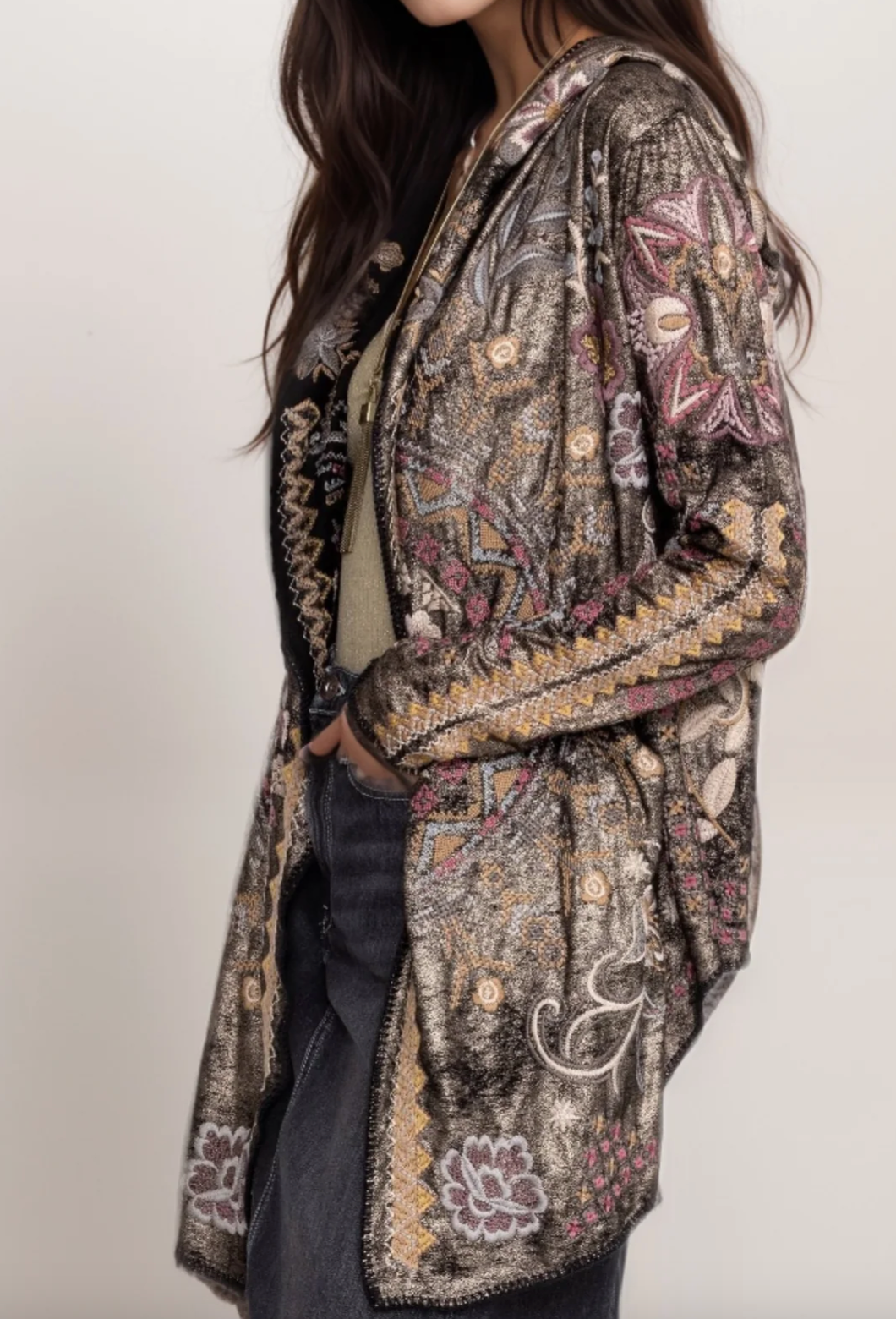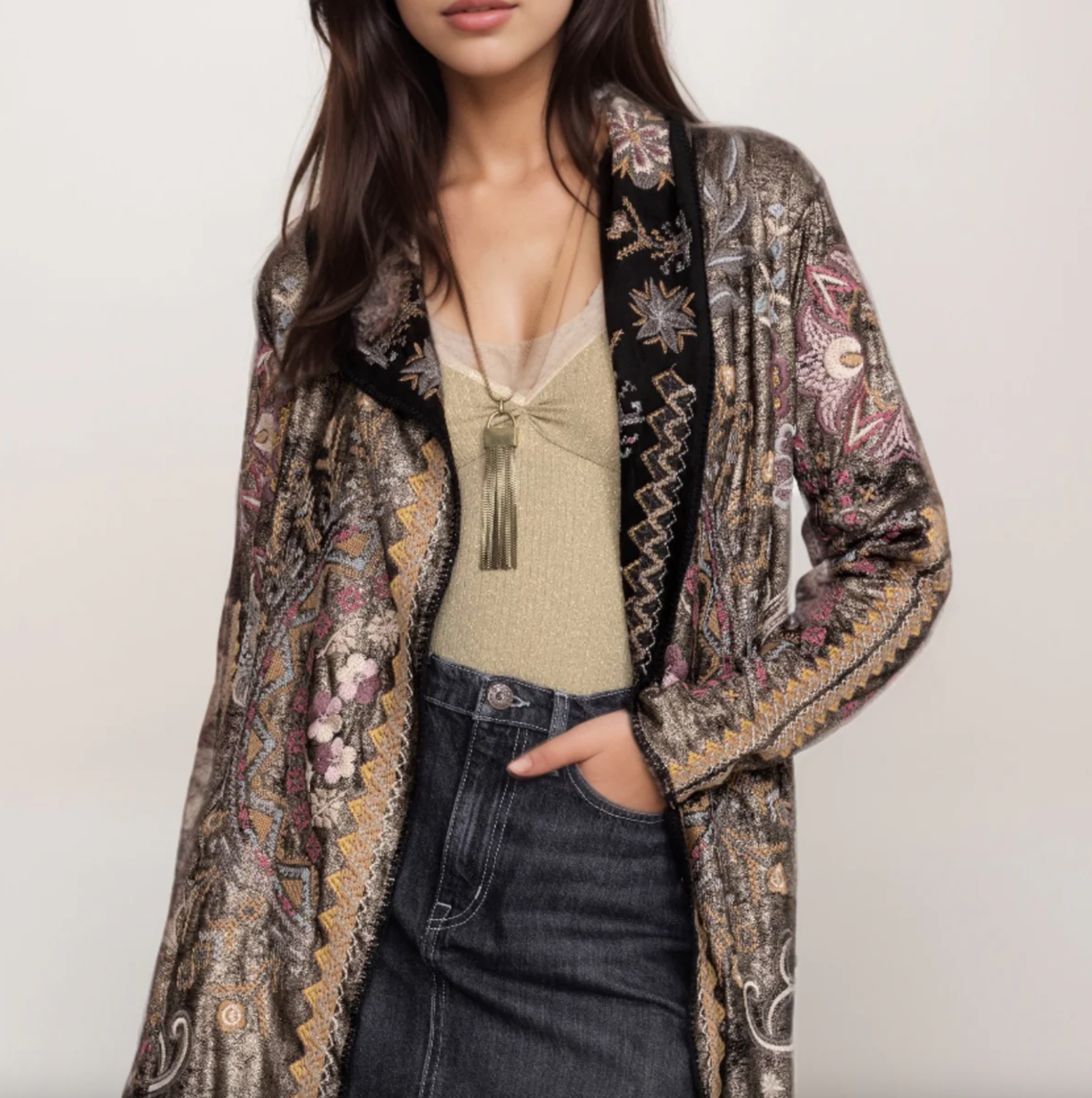 Embrace effortless style and cozy comfort with the Johnny Was Biya Metallic Short Hoodie. Made from soft, luxurious fabric, this hoodie wraps you in warmth while adding a chic, modern touch to your wardrobe. The open front design creates a relaxed, easygoing silhouette, while the hood adds an extra layer of cozy charm. Metallic embroidery delicately accents the fabric, bringing a touch of sparkle and sophistication to the hoodie’s design. With long sleeves that offer just the right amount of coverage and a cascading front hem for a flattering, flowy fit, this hoodie is the perfect blend of comfort and style. Layering over your favorite outfits, the Johnny Was Biya Metallic Short Hoodie is your go-to for a look that’s as stylish as it is cozy.
