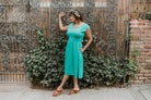 The Joy was made to be super adjustable in the bust and shoulders with back tie closure in the open back. Double lined bust so dress can be warn without a bra. Designed with bust pleats and a 3" lined waistband with skirt sheering for a little skirt flare. Deep side seam pockets that don't add bulk. 12" invisible YKK zipper that is also made in the USA. Super twirlable skirt that sits just above the knee.