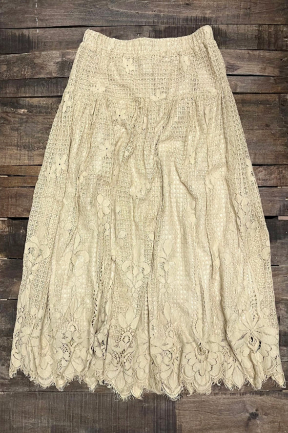 Introducing the Juliette Love Letter Skirt by Jaded Gypsy. Combining vintage lace with an inner lining for a romantic and boho-inspired look, this maxi skirt is sure to attract attention. Elegant and tasteful, its intricate detailing will bring a touch of sophistication to your style. Be enveloped in luxury with this exclusive piece!