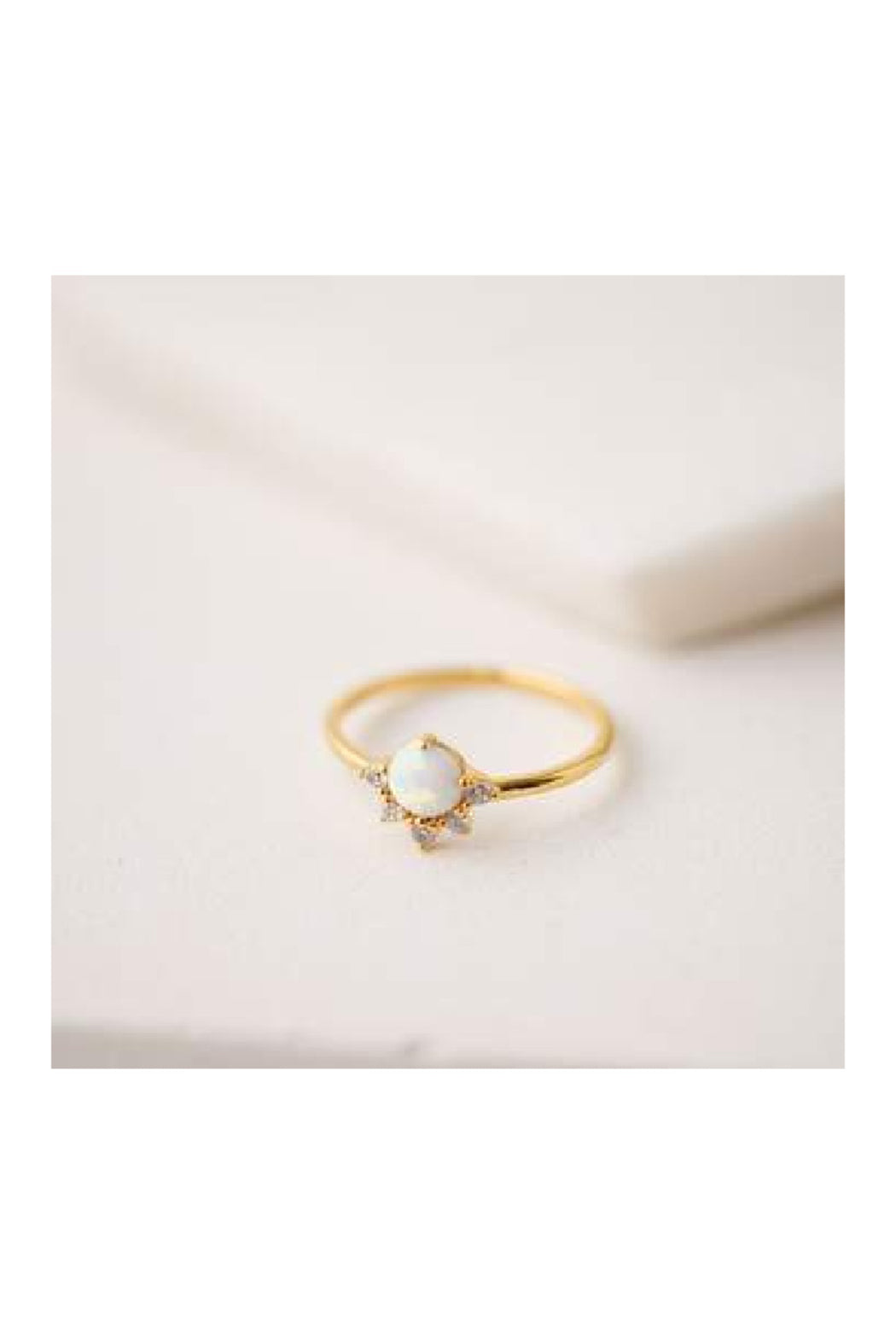An ethereal opal stone is topped with a crown of cubic zirconia crystals for a dreamy and delicate gold-plated ring that can be worn alone or as the statement piece in a radiant stack.