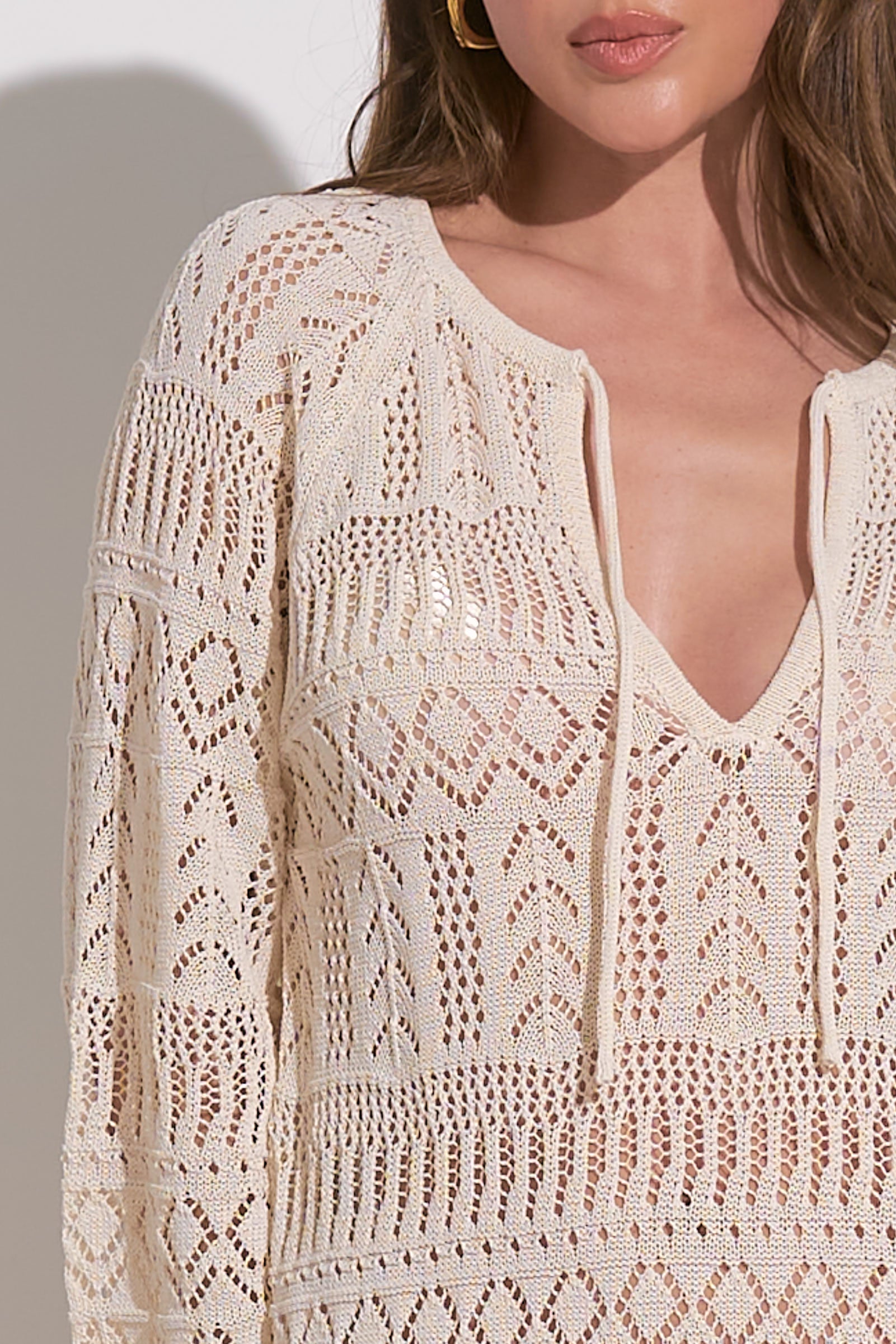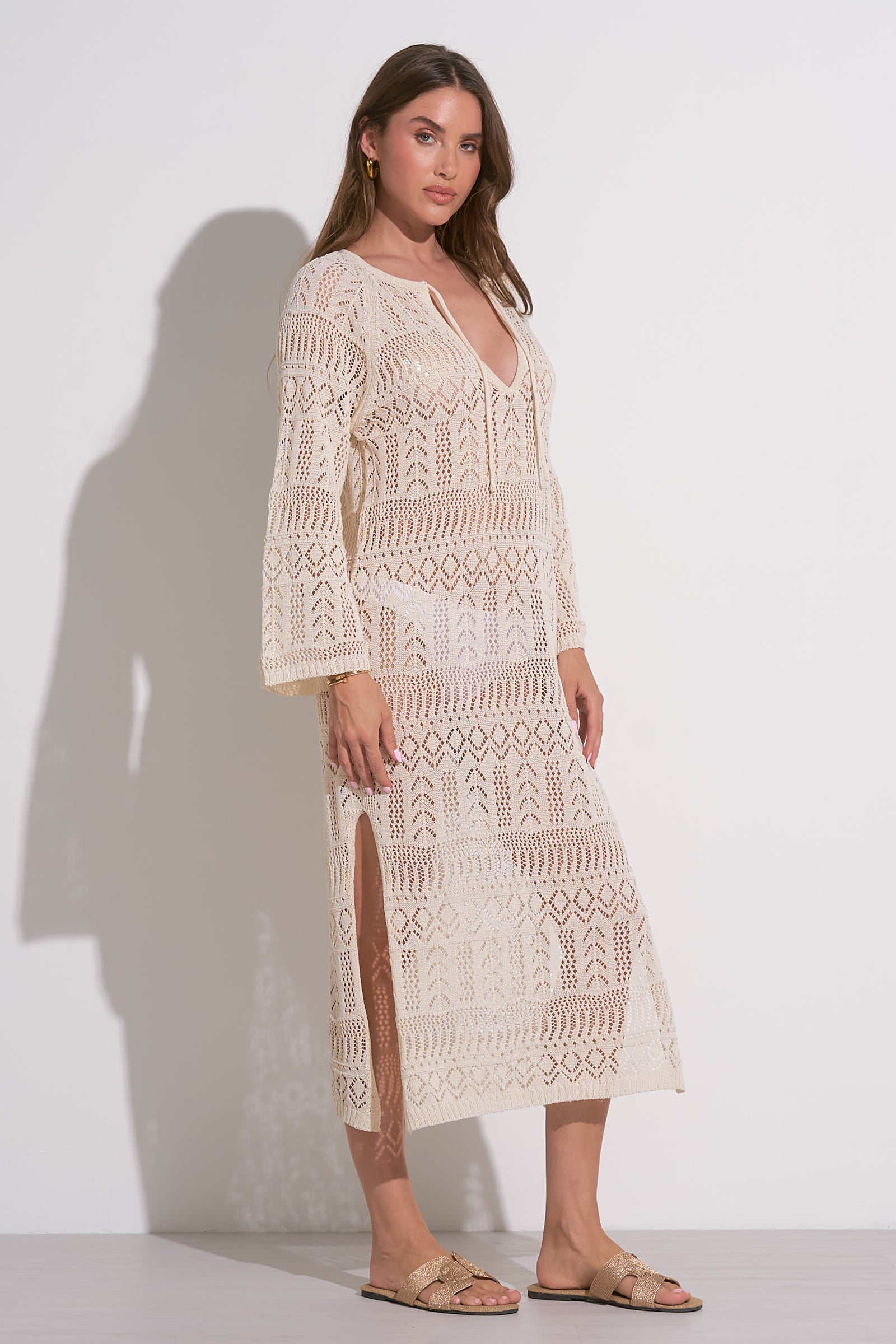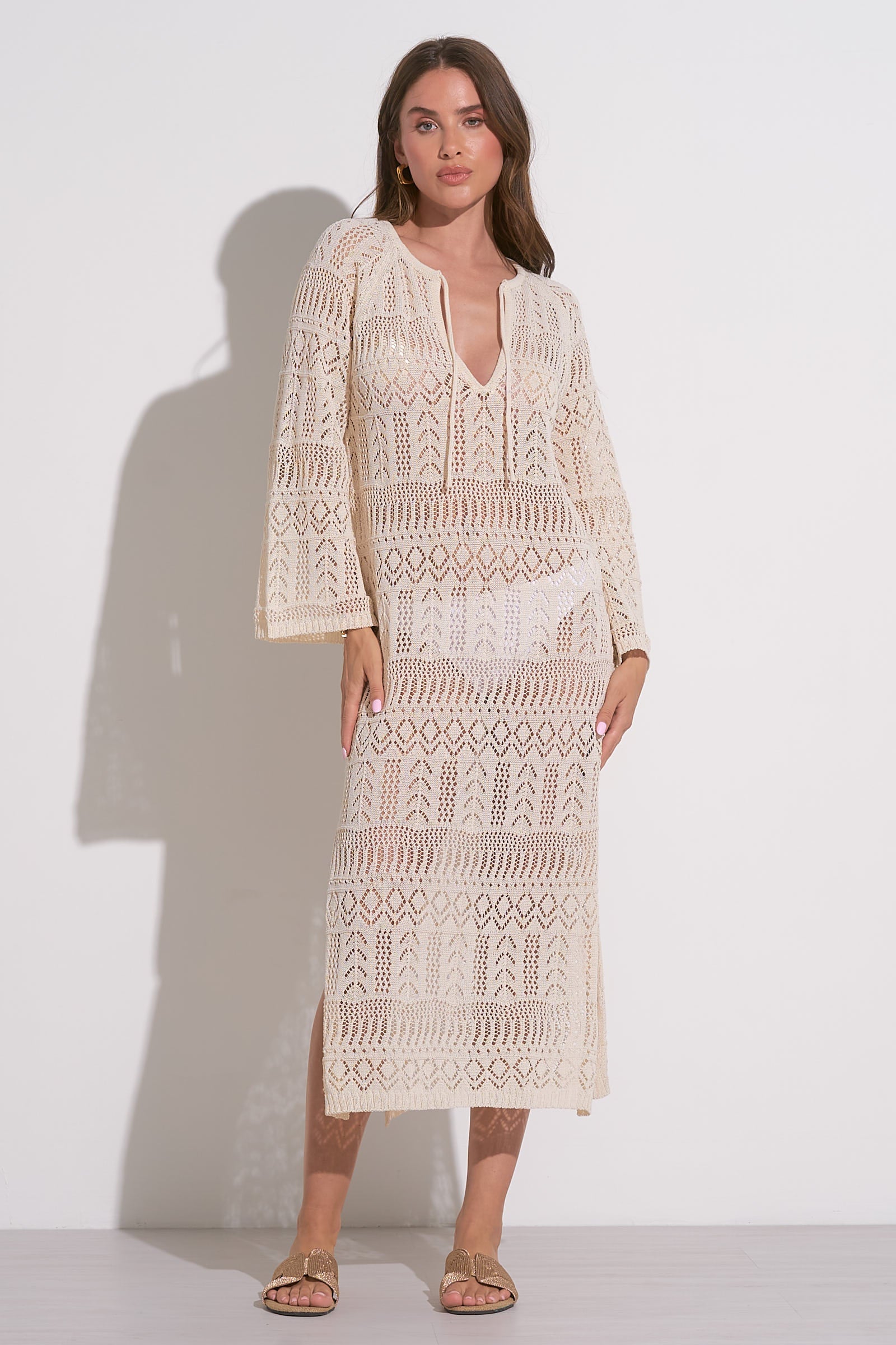 Elevate your style with this breezy and elegant kaftan, featuring intricate open-knit detailing and a relaxed silhouette. Ideal for layering over swimwear or pairing with slip dresses, it combines comfort with timeless sophistication.