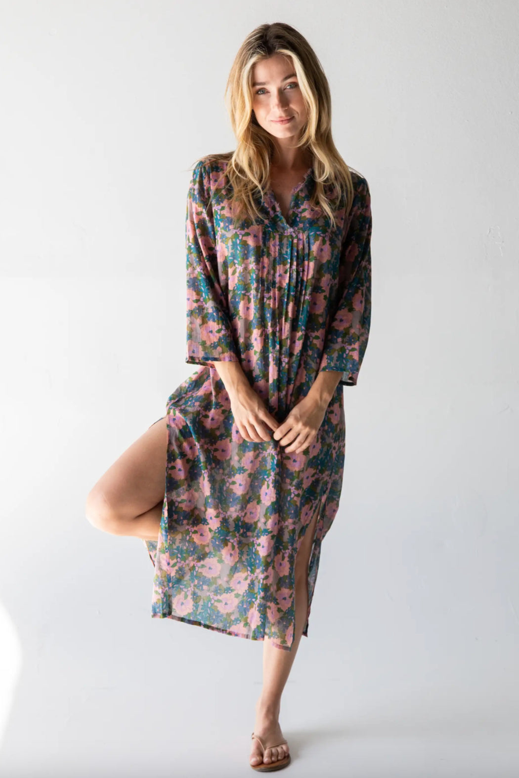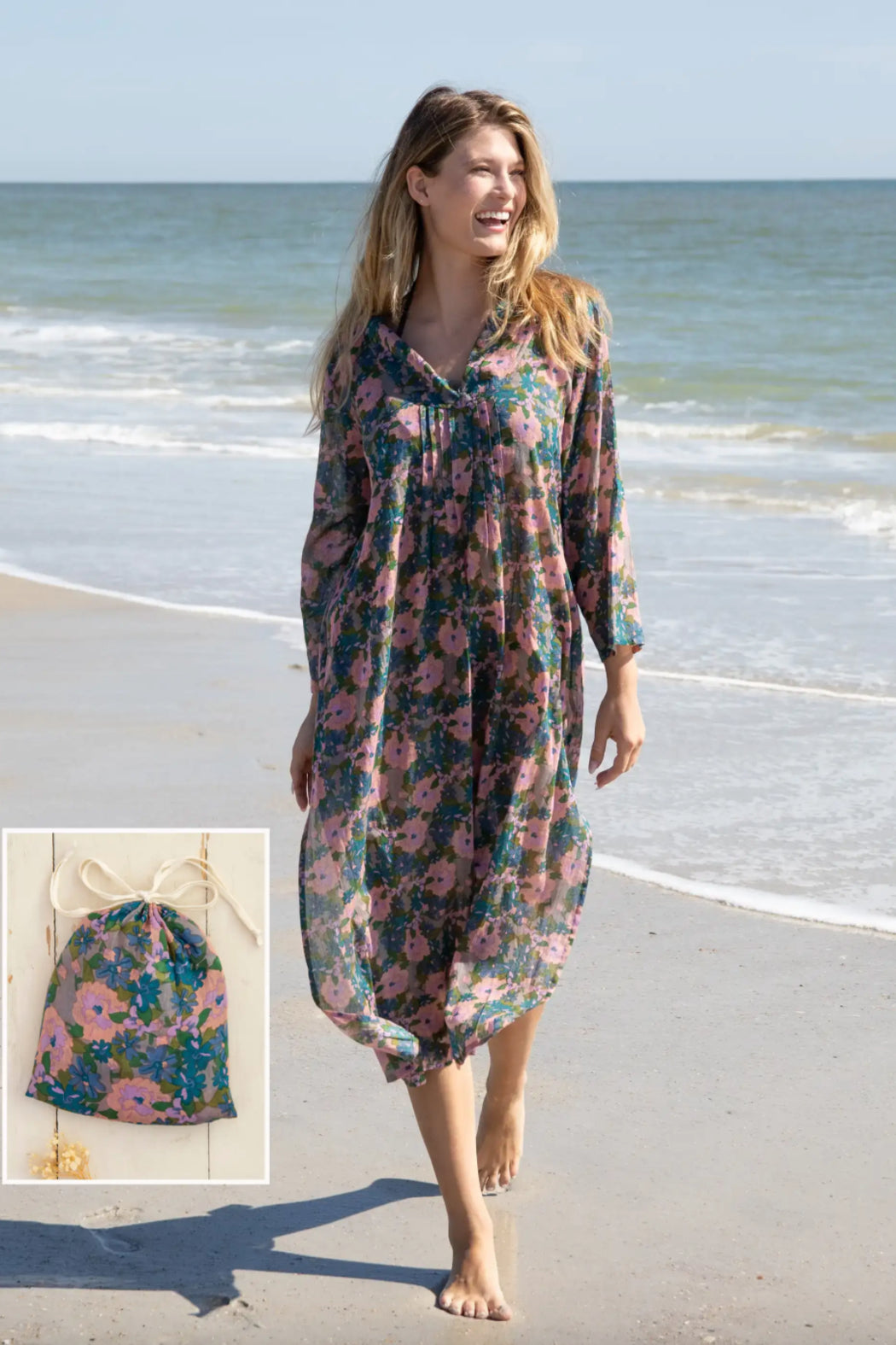 Twist and toss! Twist up your kaftan, tuck it in its boho bag, and then toss it in your beach bag or suitcase! This tunic length swimsuit cover up has three-quarter length sleeves, fun frayed edges, and is made from soft lightweight cotton. Twist your beach kaftan when it’s wet and let it air dry while it’s twisted! The crinklier – the better!! You can even slip it on with a tank and bike shorts or slip it on with denim shorts over your swimsuit and go out to lunch! Who knew that wrinkles and crinkles look adorable?! No fuss clothing makes us all happy! We’ve oversized this cute kaftan for comfiness and layering!