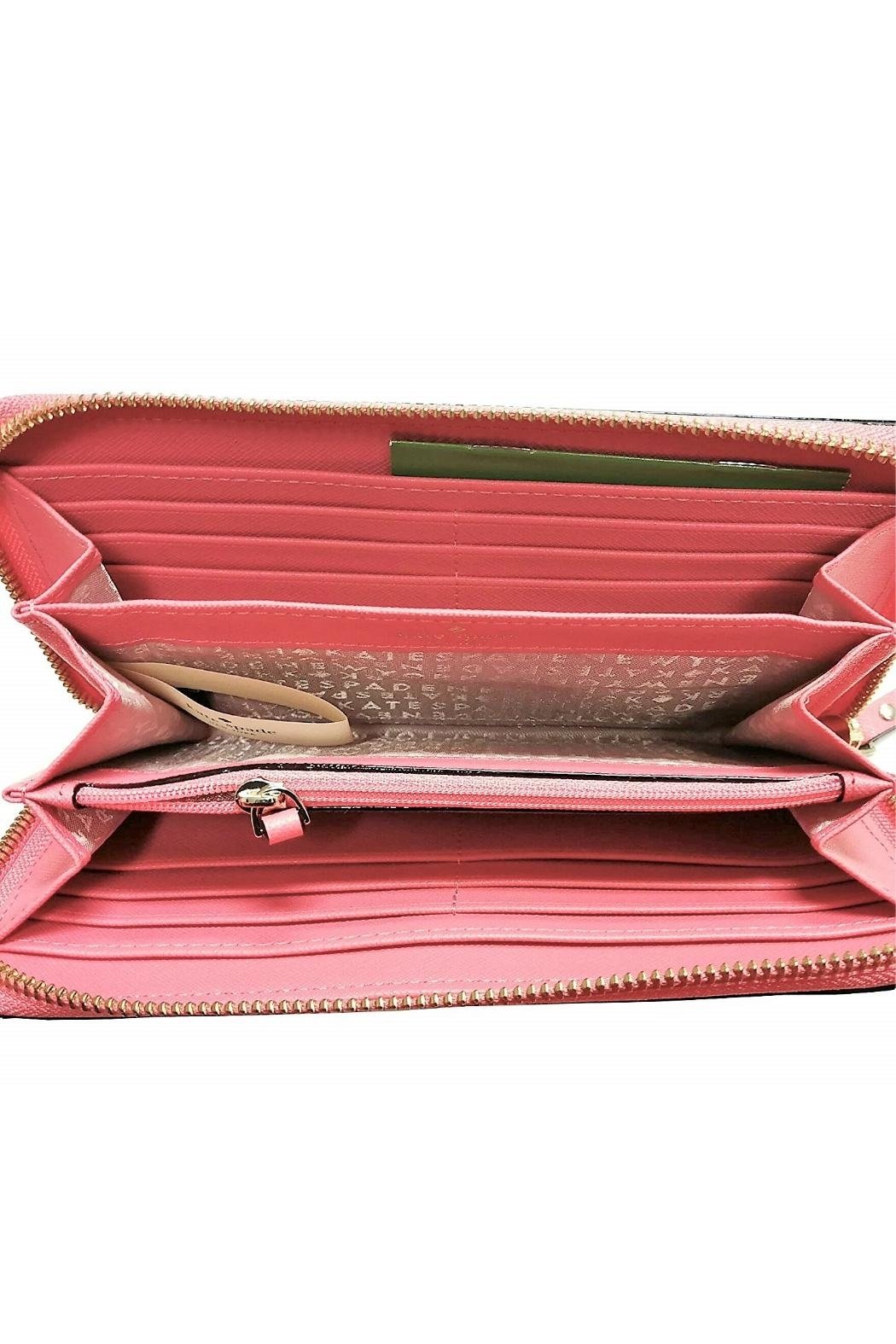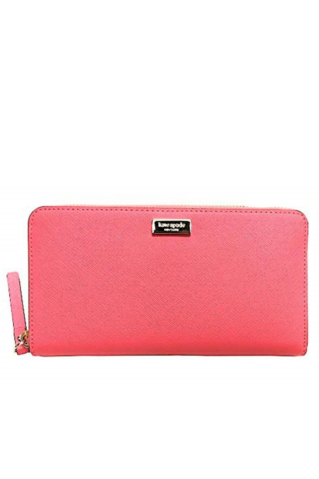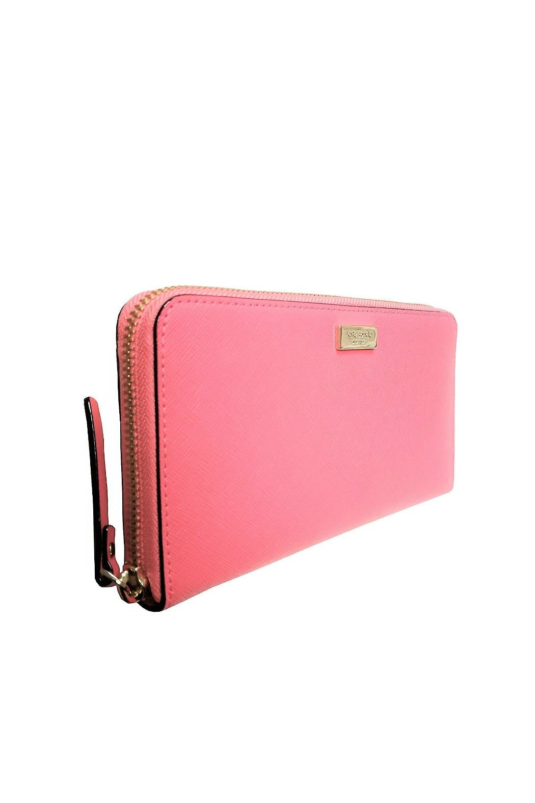 Meet the Kate Spade Leather Neda Wallet from the Laurel Way Collection in the color Warm Guava. Soft classic saffiano 100% cowhide leather with a signature polyester lining. 14k light gold plated signature plate and hardware. Inside are 12 credit card slots, zipper change pocket, 2 bill slots, and 3 pleated pockets (one will store your phone up to 7" long). On the back is a slip pocket that could also be used for a phone. Zip around continental wallet. Click on "Mimi's Gift Gallery" on this page to find other Kate Spade accessories. Dimensions: 8" long x 4" high.