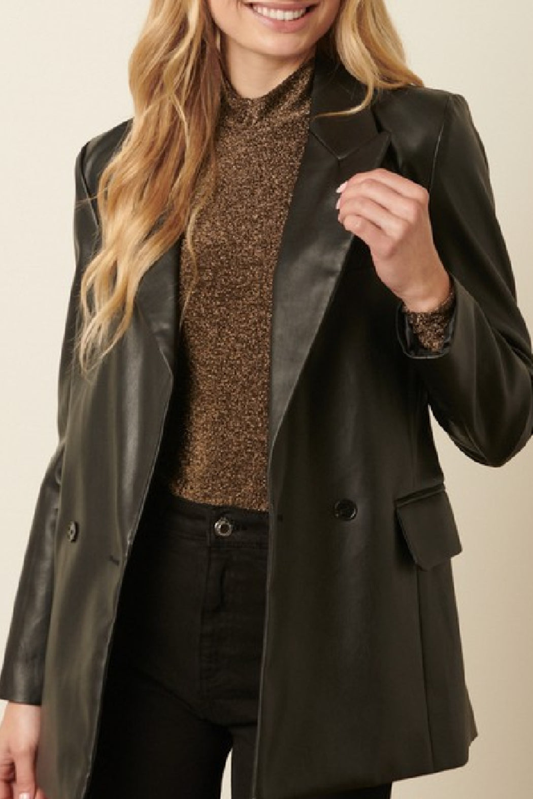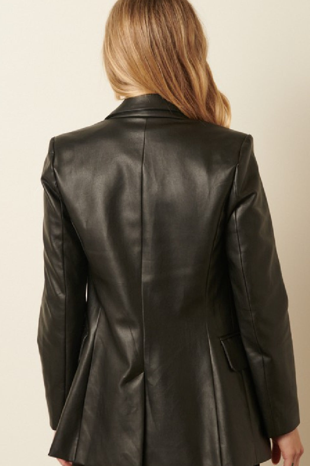 Classic, double breasted, longline blazer with lapel, chest pocket, side pockets and back vent. Faux Leather. Refer to measurements for your perfect fit. Across chest measurements; Small 17", Medium 18", Large 19". Shoulder to hem; Small 29", Medium 29.5", Large 30". Across shoulder measurements; Small 15", Medium 16", Large 17".