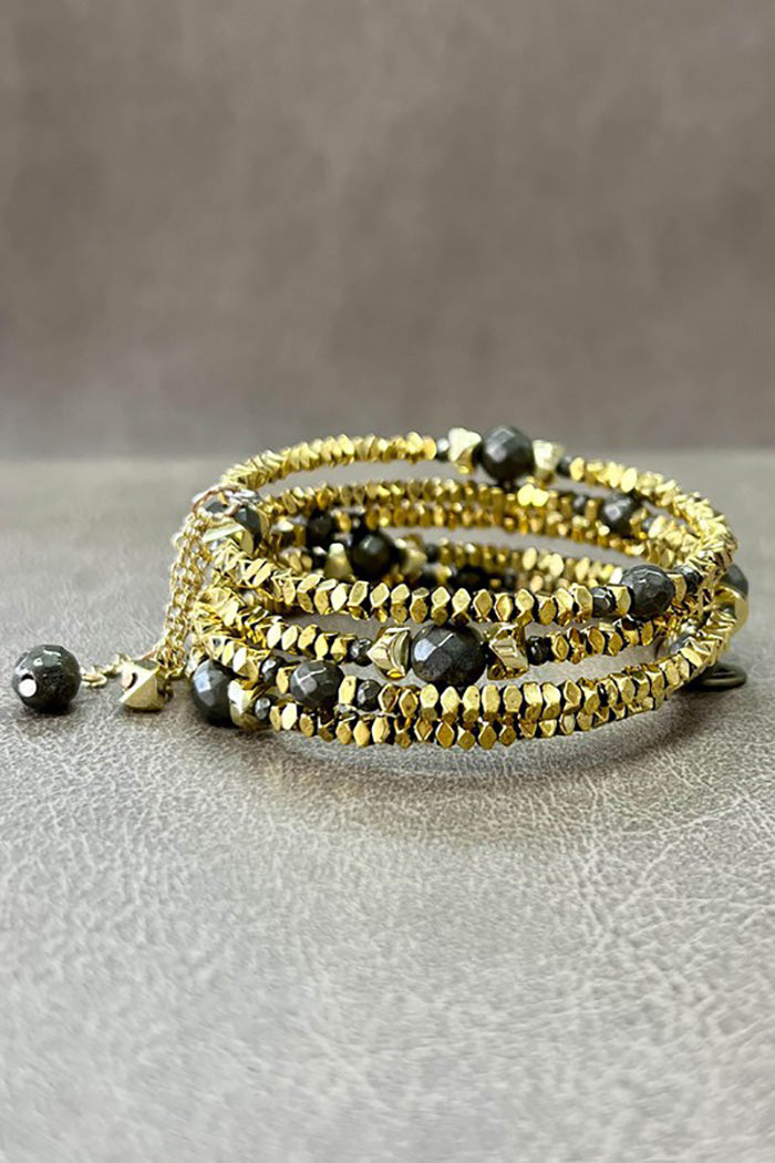 Kayla Bracelet Gold. Slinky beaded bracelet with gold and gray beading. Diameter- 2.5"