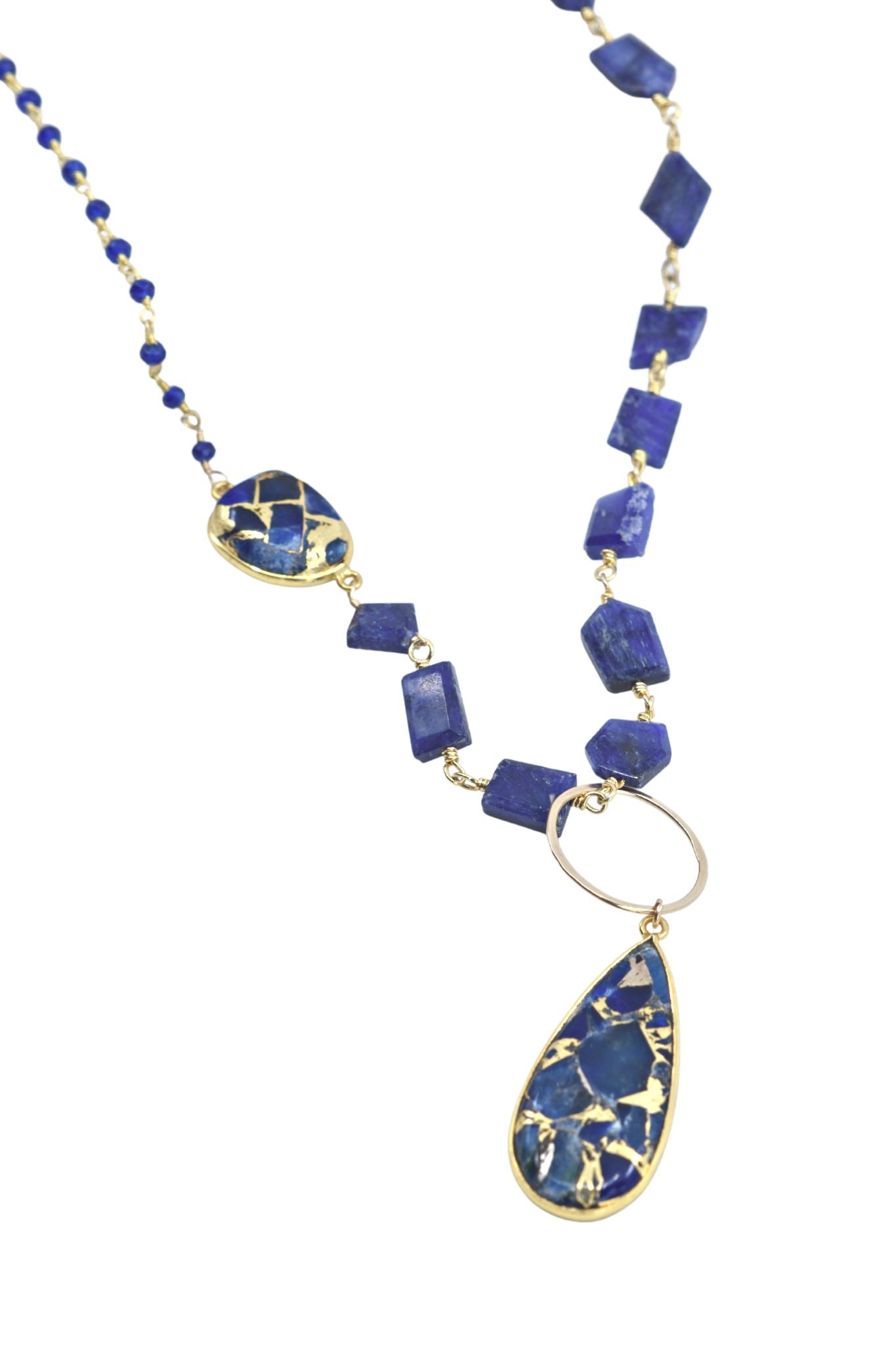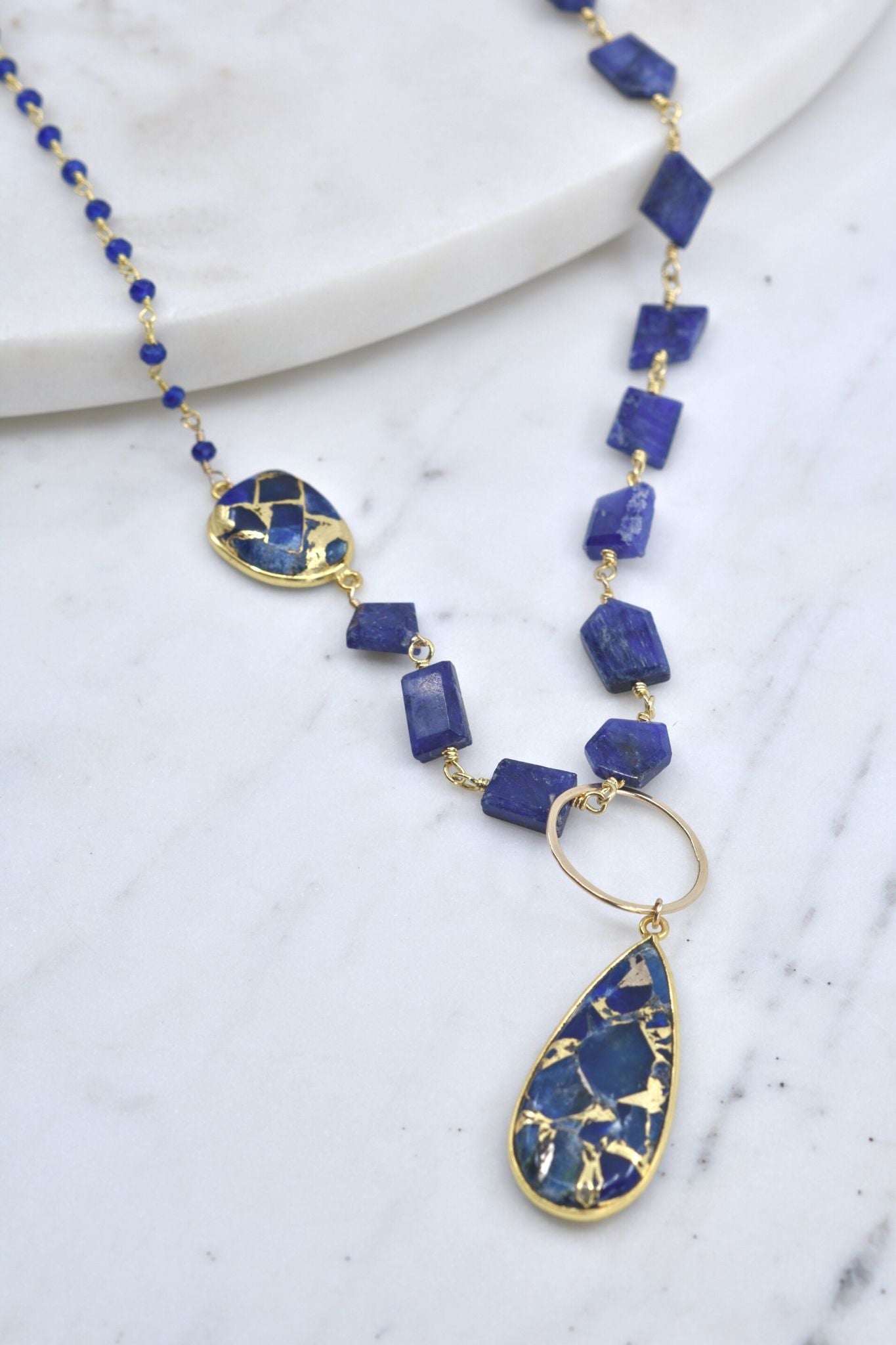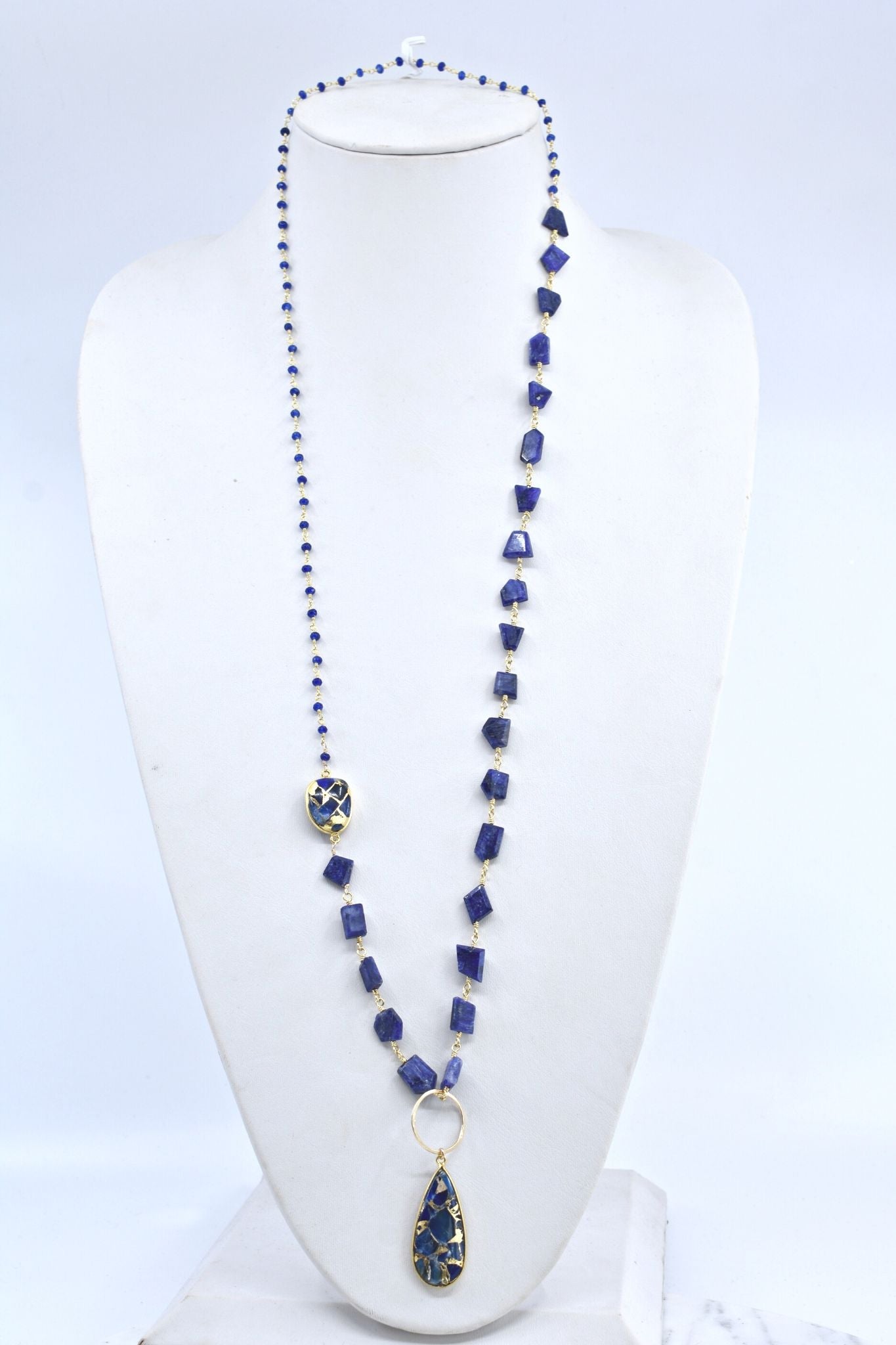 A versatile long style necklace made with blue copper turquoise pendants and sapphire chain. This necklace can be layered, worn as a lariat, or adjusted to have either the chunky chain or simple chain as the detail of your center piece.