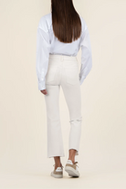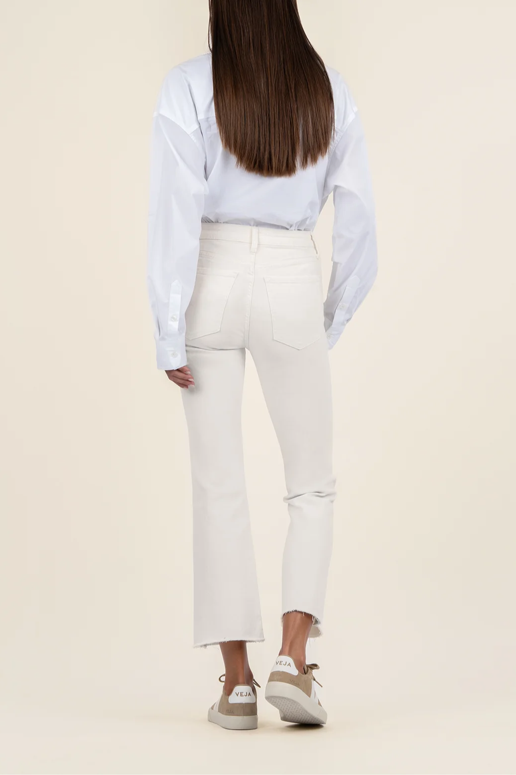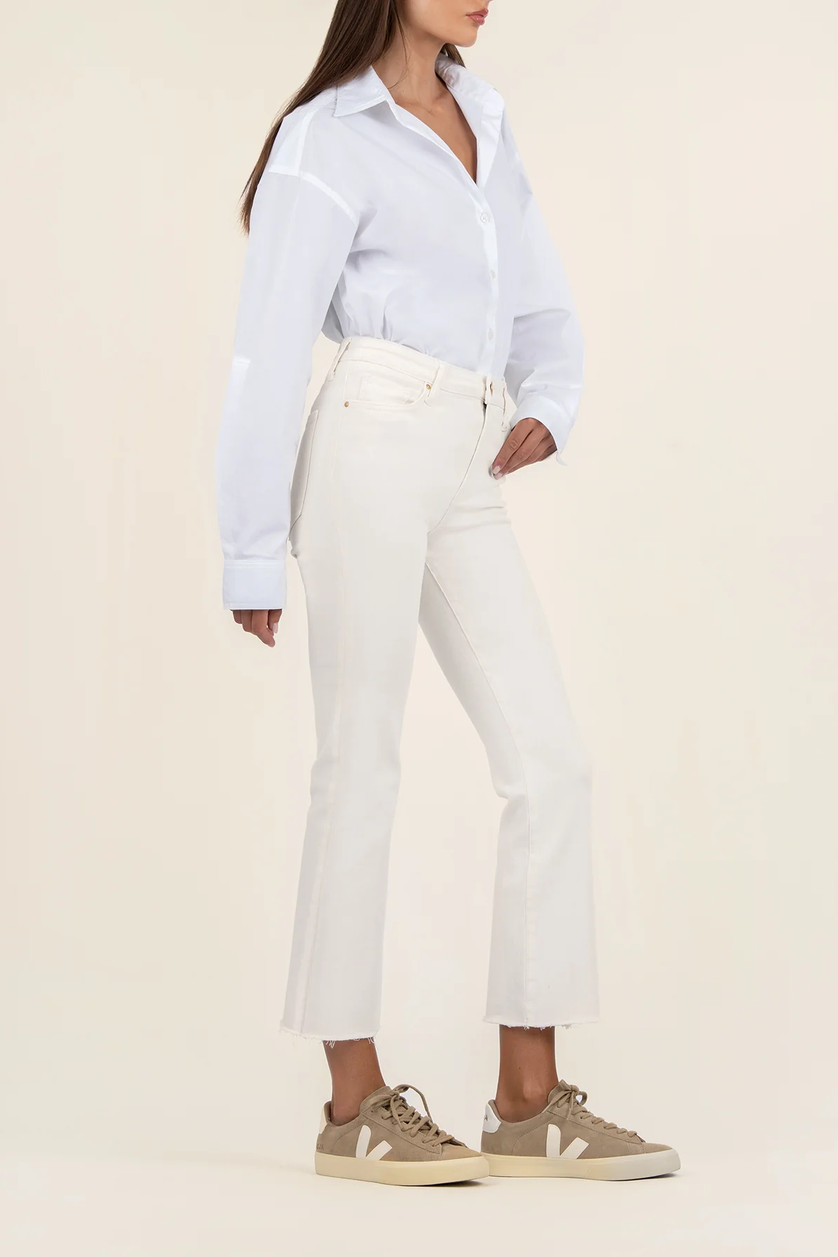 Create chic monochrome looks in these raw-cropped flare jeans made from smooth stretch denim in a tonal ecru wash.