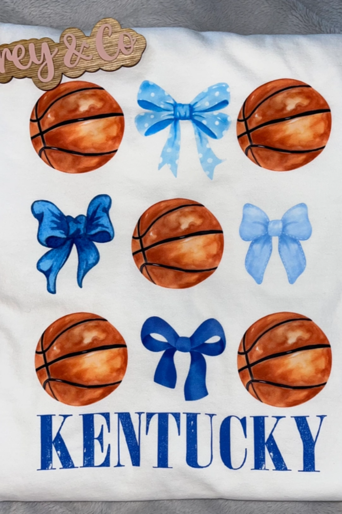 White, heavy blend, Gildean sweatshirt with blue bows, basketballs, and Kentucky logo.