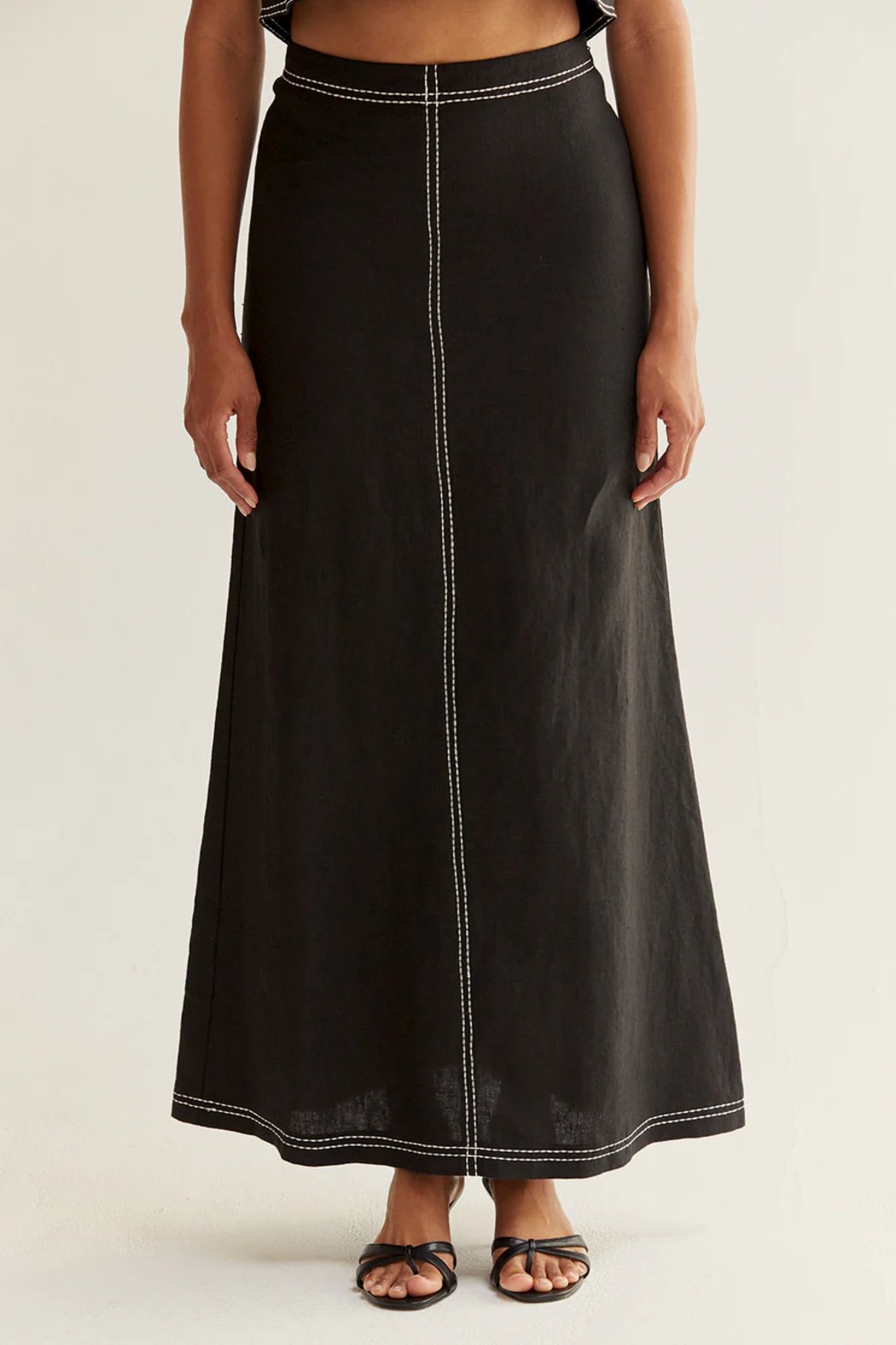 Our beloved Kenzy Contrast Stitch Linen Maxi Skirt is a high-waisted, straight line skirt with a side hook & eye and invisible zipper closure, and a contrast embroidery stitching detail all around.
