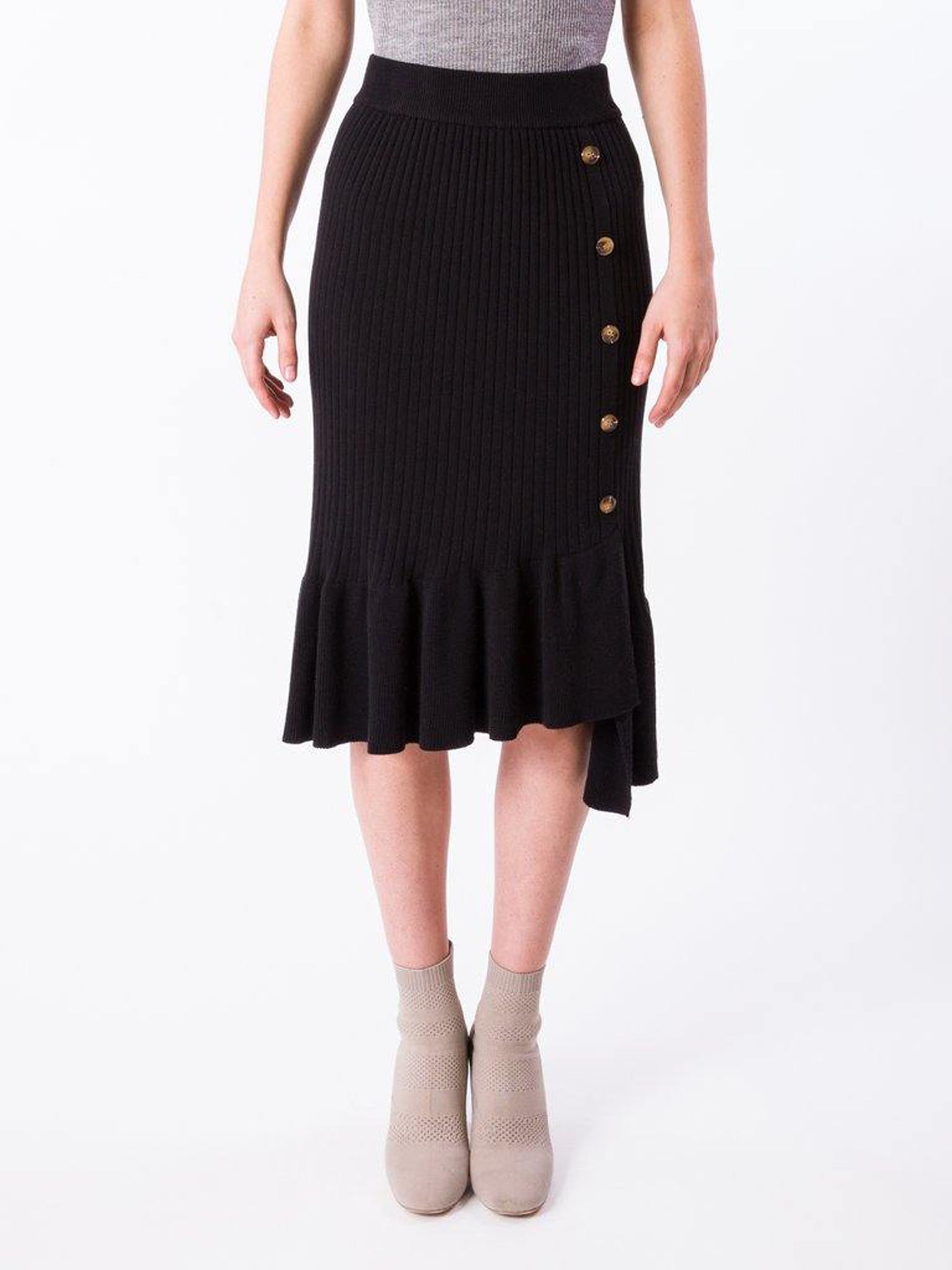 The goal is to create an astonishing look with the help of this knit Salsa Skirt by Kerisma. An easy impactful piece. This asymmetrical detailed skirt features buttons down the front and knee length.