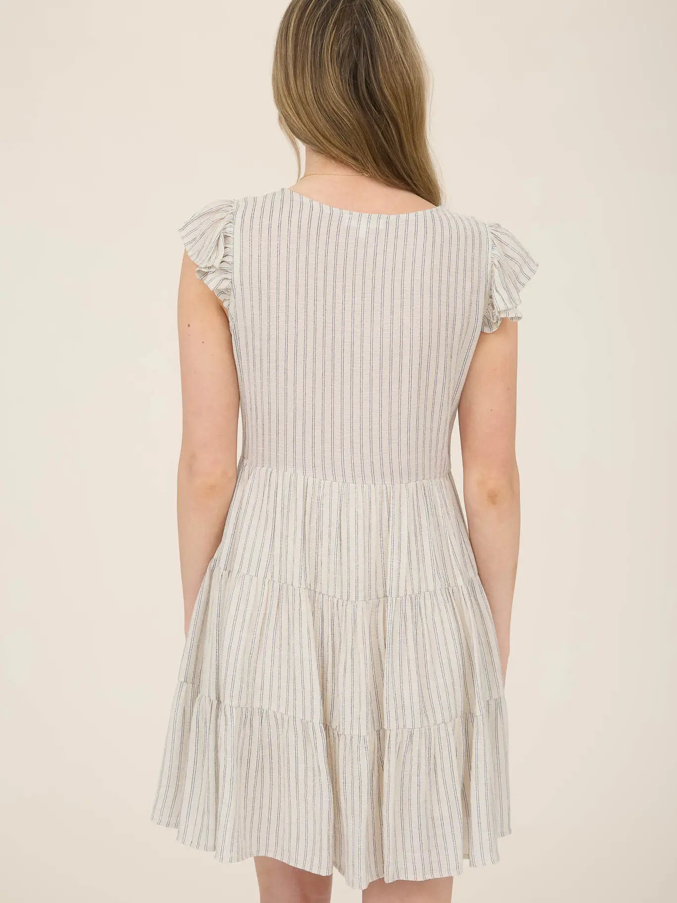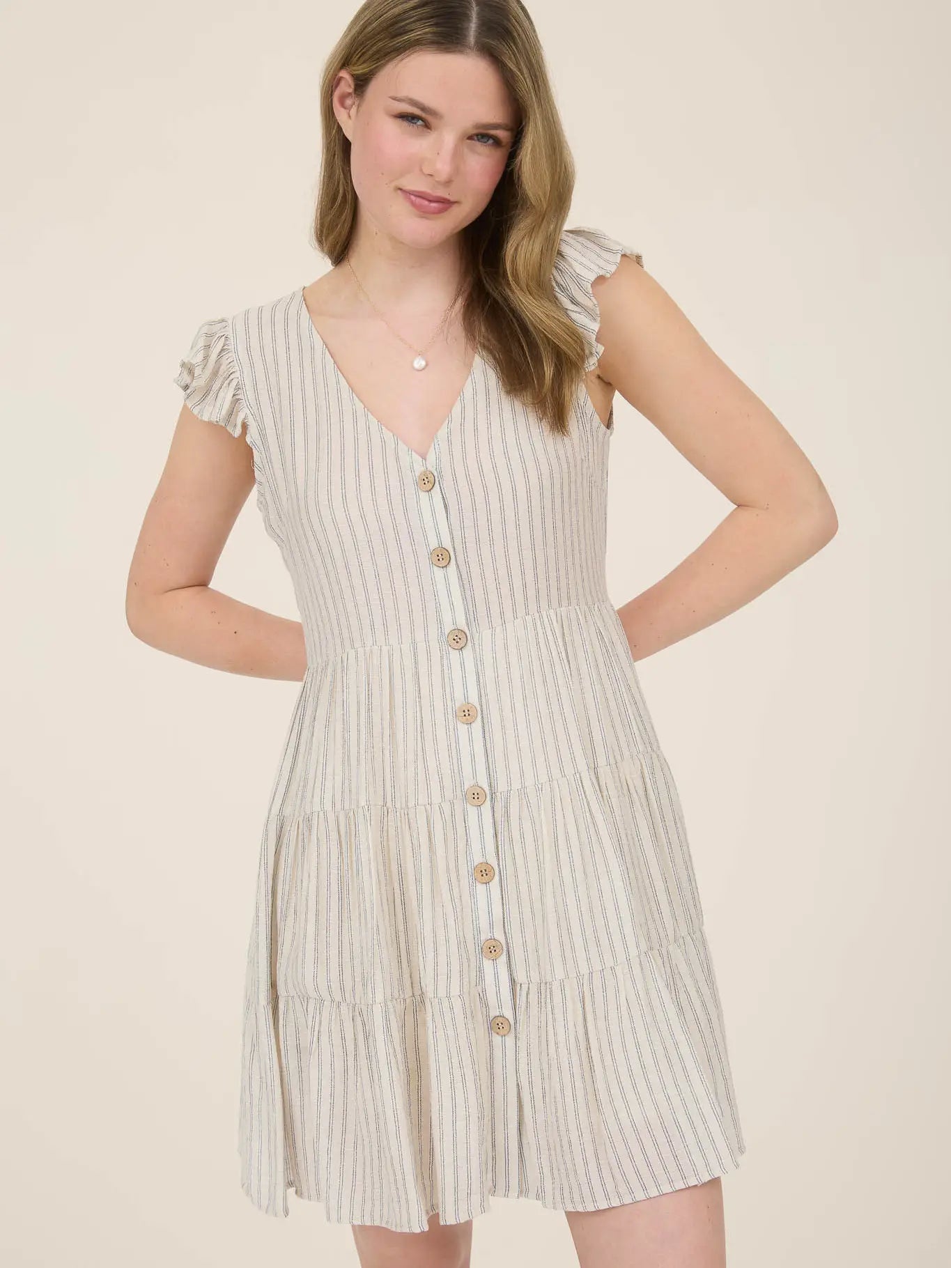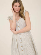 This khaki striped mini dress features a flattering V-neckline and tiered design, enhanced by ruffle sleeves for a feminine touch. It has a button-front style with partially functional buttons and a chic striped pattern. Fully lined for comfort, the dress is crafted from a blend of 80% rayon and 20% nylon, with a 100% polyester lining. Perfect for stylish, effortless wear.