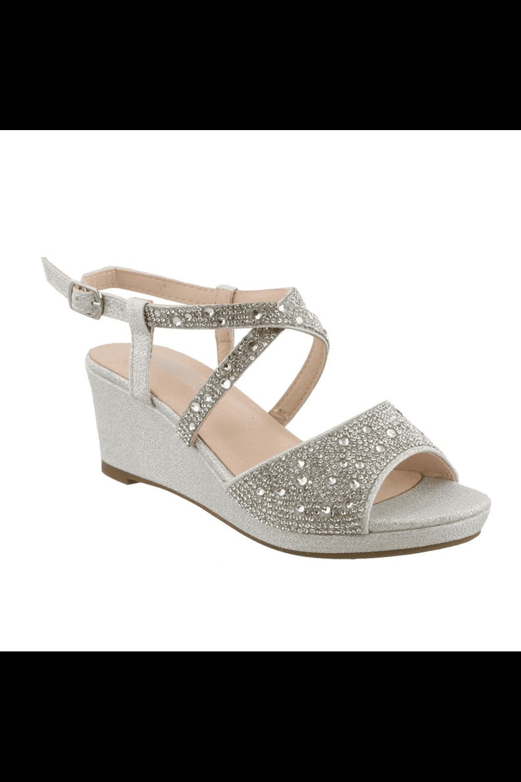 This kid's silver wedge is the perfect shoe for flower girls, pageants, communion, or any other special event in your kids life. The wedge style of the shoe makes it easy for all day comfort for your kid. The wedge is approximately 2" tall but it also has a little platform in the front. Don't miss out on this shoe!