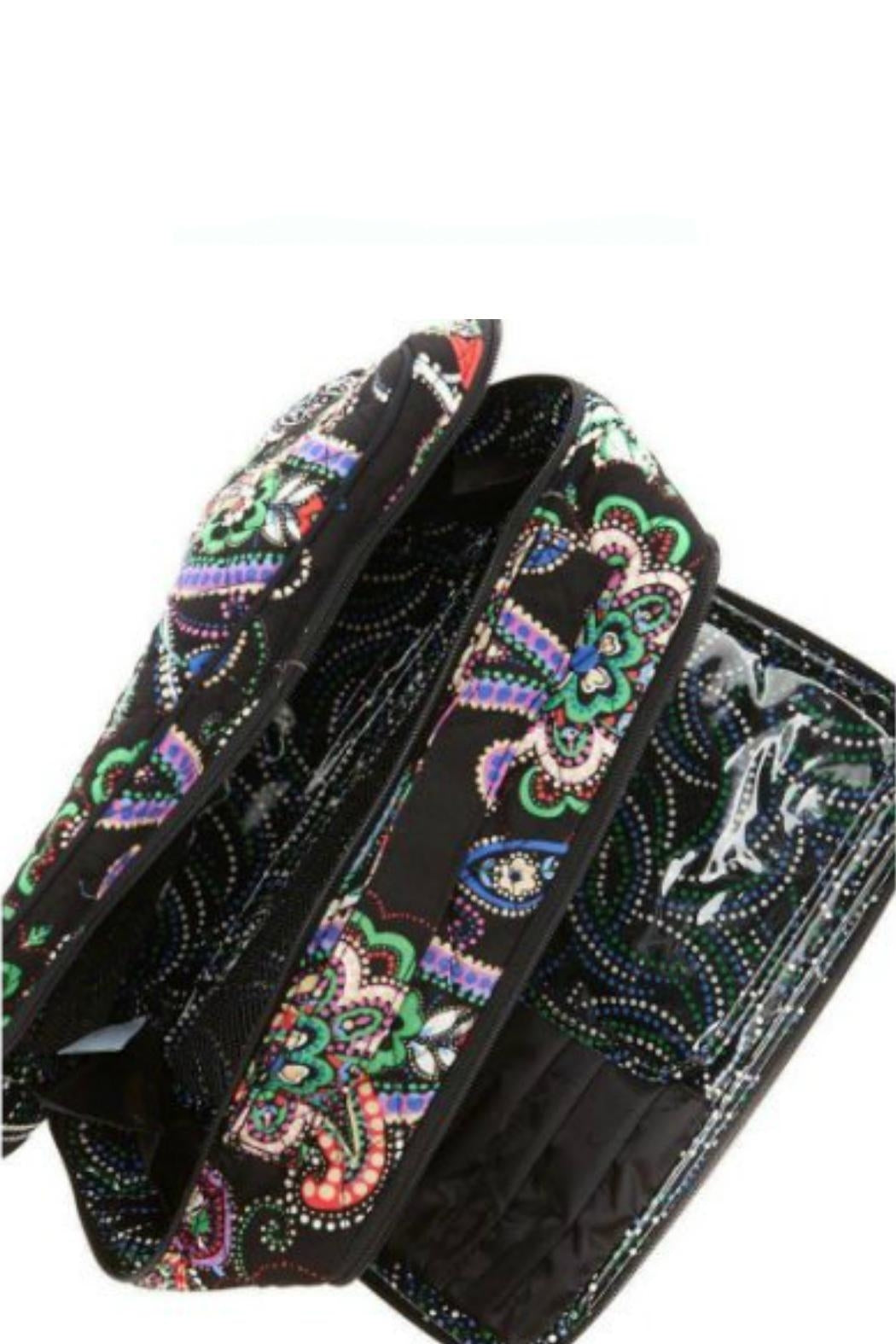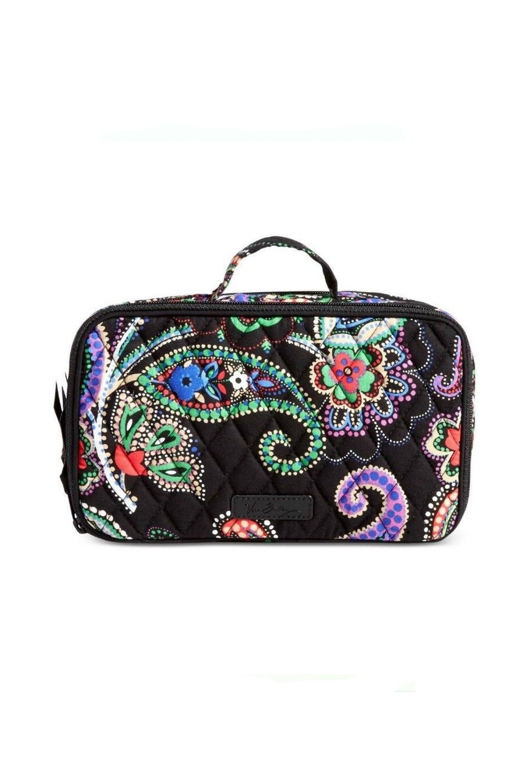 Here is the Vera Bradley Brush & Blush Makeup Case in the Kiev Paisley pattern. Pack your makeup and hair care essentials inside this peppy case that comes with five built-in brush slots to optimize organization. Beautiful quilted cotton exterior, with a pvc covered coordinating print liner. Zip closure. Two zippered compartments. Find other accessories in the Kiev Paisley pattern on the "Mimi's Gift Gallery" boutique page. Dimensions 8.5'' Wide x 5'' High x 3.5'' Deep. 1.5'' handle drop.