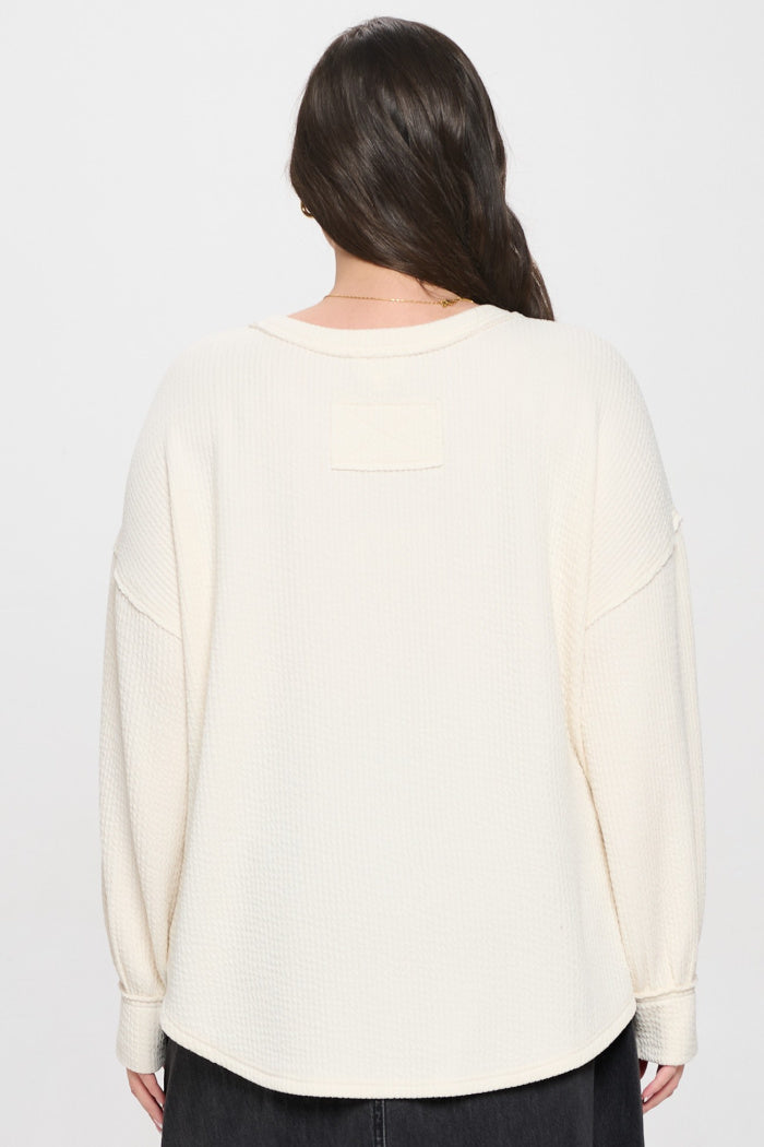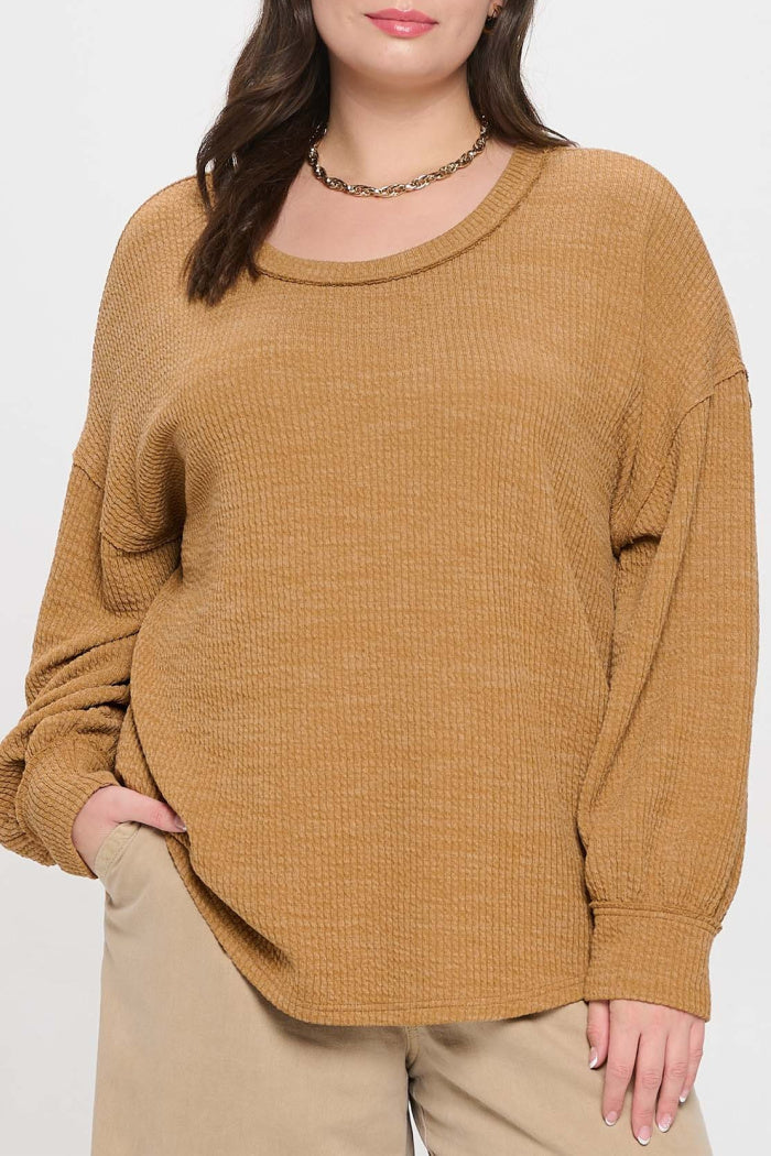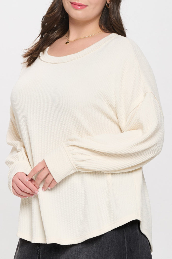 Casual pullover long sleeve top with rounded hi/lo hem and drop shoulder. Nice stretch. Model is wearing a size 1X. Refer to measurements for your perfect fit.